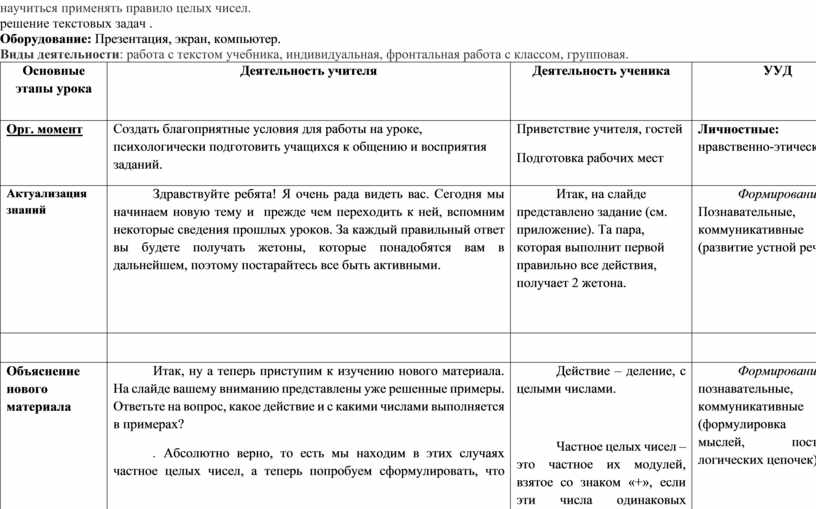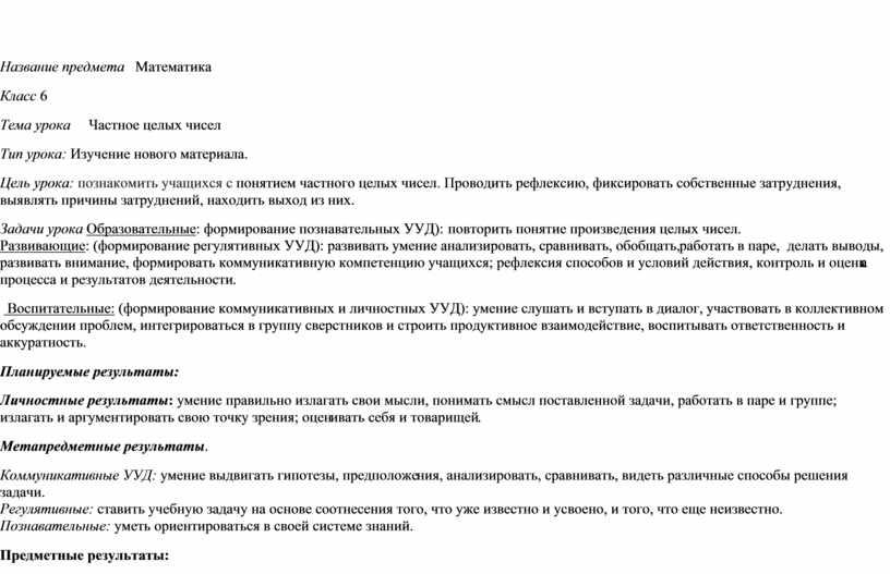 Цель урока: познакомить учащихся с понятием частного целых чисел. Проводить рефлексию, фиксировать собственные затруднения, выявлять причины затруднений, находить выход из них.