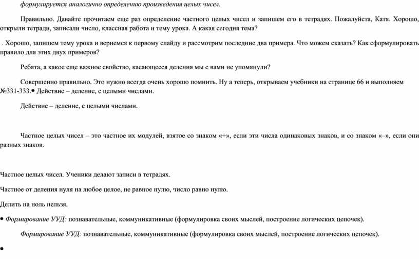 Итак, ну а теперь приступим к изучению нового материала. На слайде вашему вниманию представлены уже решенные примеры. Ответьте на вопрос, какое действие и с какими числами выполняется в примерах? . Абсолютно верно, то есть мы находим в этих случаях частное целых чисел, а теперь попробуем сформулировать, что такое частное целых чисел. Подсказка: частное целых чисел формулируется аналогично определению произведения целых чисел. Правильно. Давайте прочитаем еще раз определение частного целых чисел и запишем его в тетрадях. Пожалуйста, Катя. Хорошо, открыли тетради, записали число, классная работа и тему урока. А какая сегодня тема? . Хорошо, запишем тему урока и вернемся к первому слайду и рассмотрим последние два примера. Что можем сказать? Как сформулировать правило для этих двух примеров? Ребята, а какое еще важное свойство, касающееся деления мы с вами не упомянули? Совершенно правильно. Это нужно всегда очень хорошо помнить. Ну а теперь, открываем учебники на странице 66 и выполняем №331-333. |