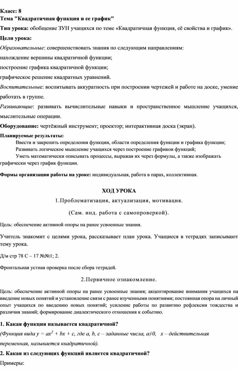 Тип урока: обобщение ЗУН учащихся по теме «Квадратичная функция, её свойства и график».