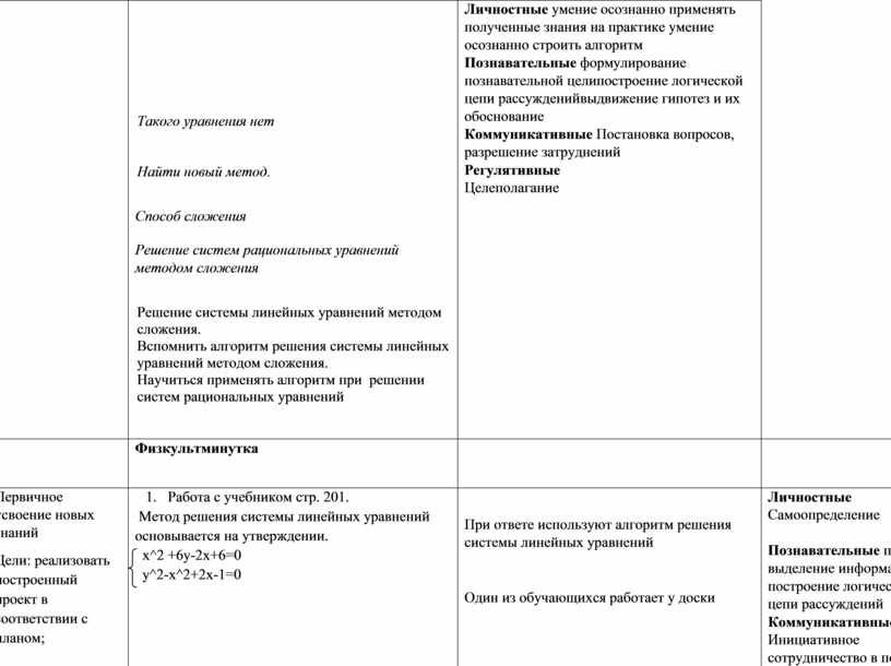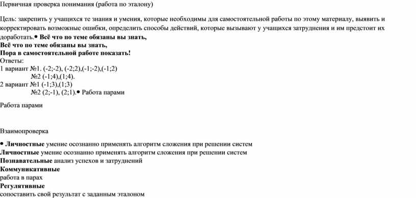 Личностные умение осознанно применять алгоритм сложения при решении систем Познавательные анализ успехов и затруднений Коммуникативные работа в парах Регулятивные сопоставить
