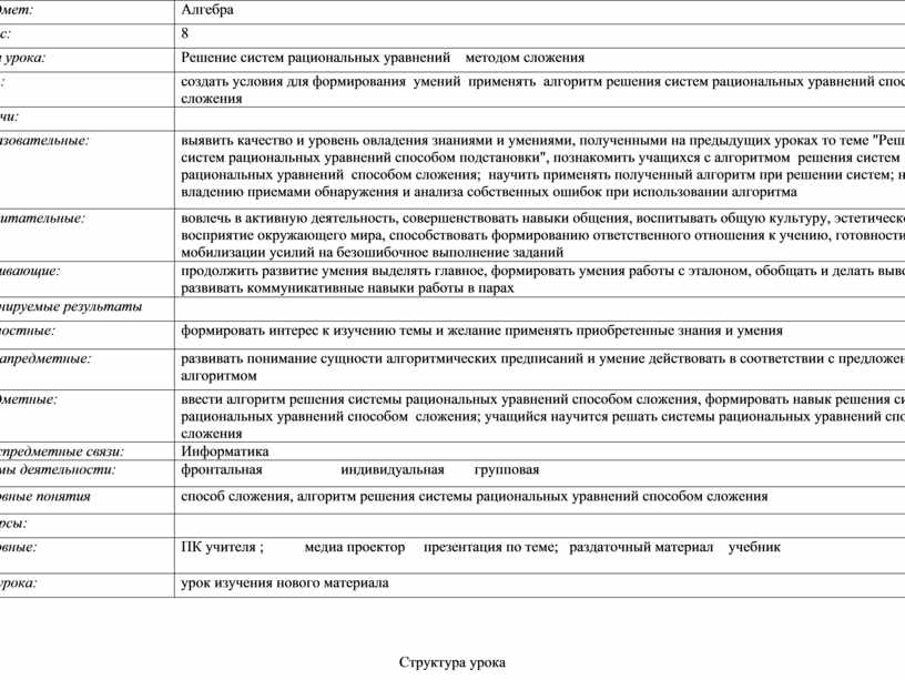 выявить качество и уровень овладения знаниями и умениями, полученными на предыдущих уроках то теме "Решения систем рациональных уравнений способом подстановки", познакомить учащихся с алгоритмом решения систем рациональных уравнений способом сложения; научить применять полученный алгоритм при решении систем; научить владению приемами обнаружения и анализа собственных ошибок при использовании алгоритма |