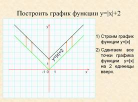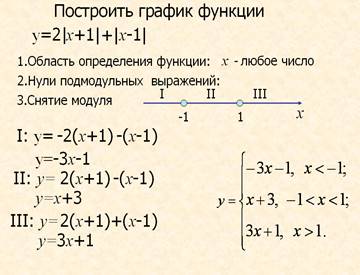 Ну а сейчас я вам покажу, как строить графии функции, содержащих сумму нескольких модулей. Рассмотрим случай, когда уравнение функции содержит сумму двух модулей. (слайд 18-19)