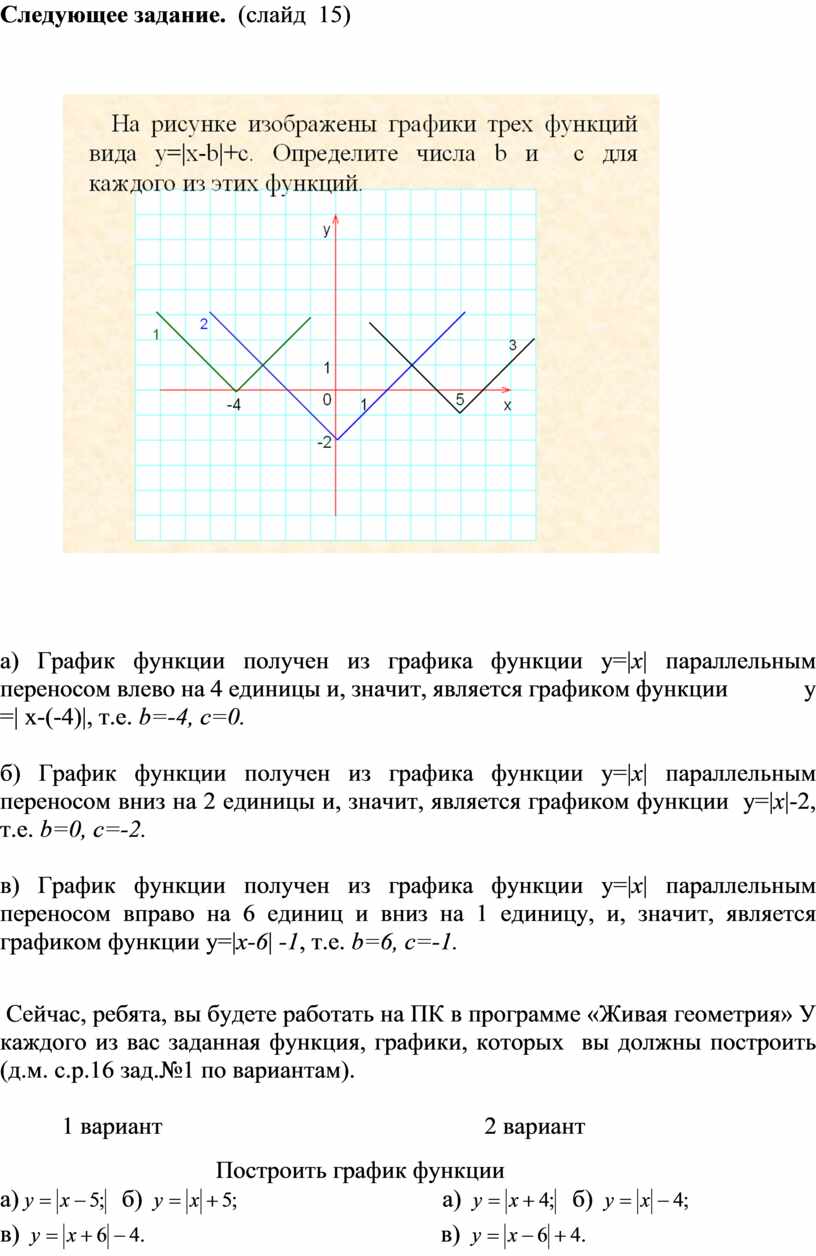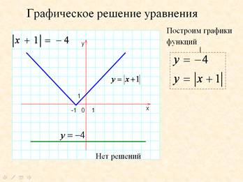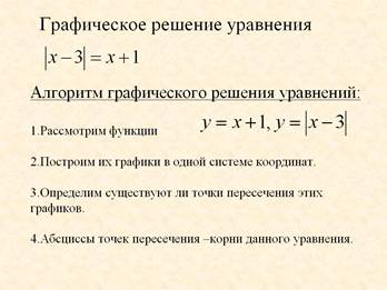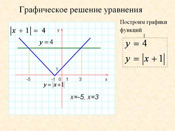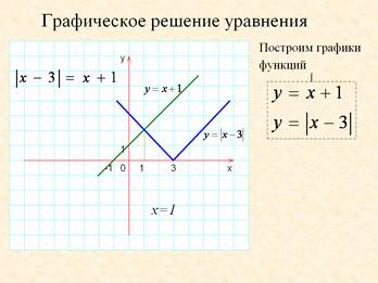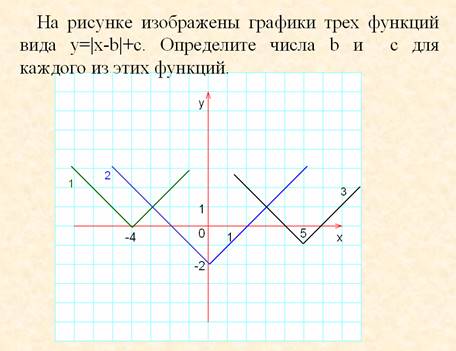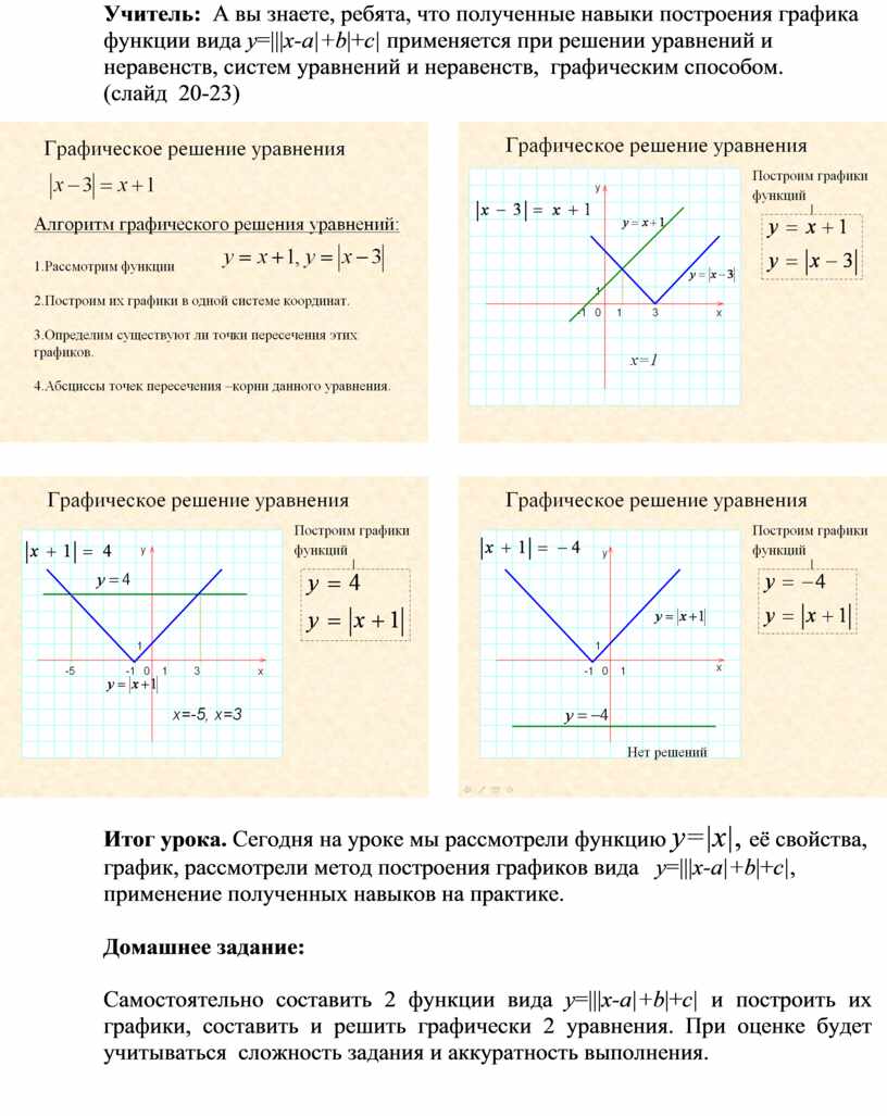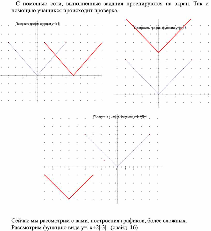 Учитель: А вы знаете, ребята, что полученные навыки построения графика функции вида у=|||x-a|+b|+c| применяется при решении уравнений и неравенств, систем уравнений и неравенств, графическим способом.