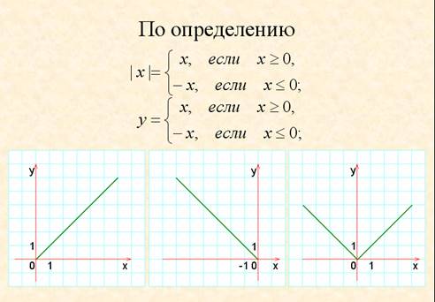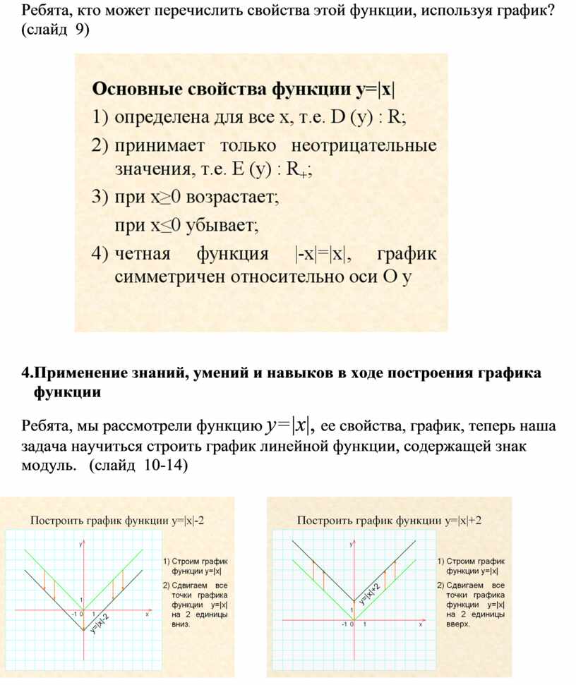 Ребята, мы рассмотрели функцию у=|x|, ее свойства, график, теперь наша задача научиться строить график линейной функции, содержащей знак модуль. (слайд 10-14)