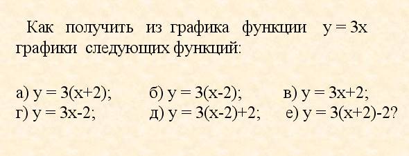 а) график функции получим из графика функции у=3х параллельным переносом на 2 единицы влево;
