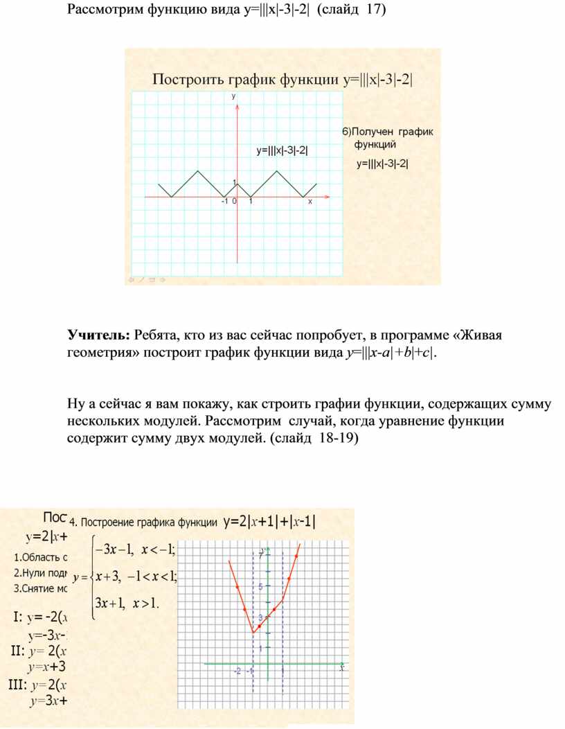 Учитель: Ребята, кто из вас сейчас попробует, в программе «Живая геометрия» построит график функции вида у=|||x-a|+b|+c|.