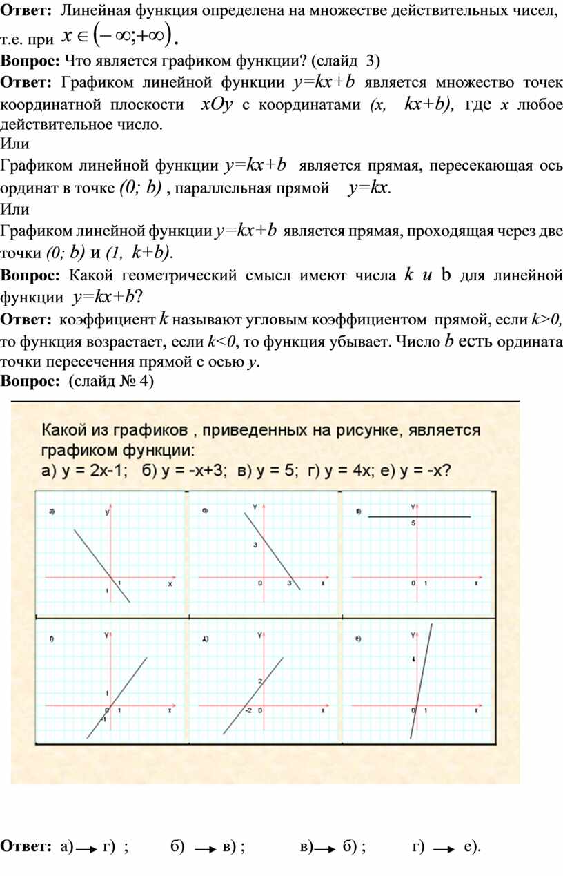 Ответ: Функция вида y=kx+b, где k и b – данные числа, называют линейной функцией.