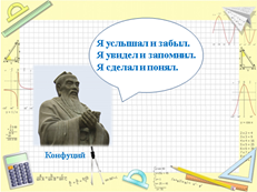 - Здравствуйте, ребята. Я – Кузьмин Сергей Юрьевич, учитель математики Антоновской средней школы. Сегодня в рамках конкурса «Учитель года» мы проведем с вами урок алгебры. - Ребята, Конфуций говорил, что от настроения, с которым вы начинаете день или какое-то дело, зависят ваши успехи, а возможно и неудачи. Как вы считаете, от чего ещё, кроме настроения, зависит успех человека? (Что должен делать человек, чтобы быть успешным?) (Ответы детей.) Обобщая ваши слова, можно сказать, успешность человека зависит от его умения поставить перед собой цель, и умения добиваться этой цели. Ребята, я хочу, чтобы вы тоже сегодня достигли своей цели, и в конце урока смогли объяснить что помогло вам этого достичь. |