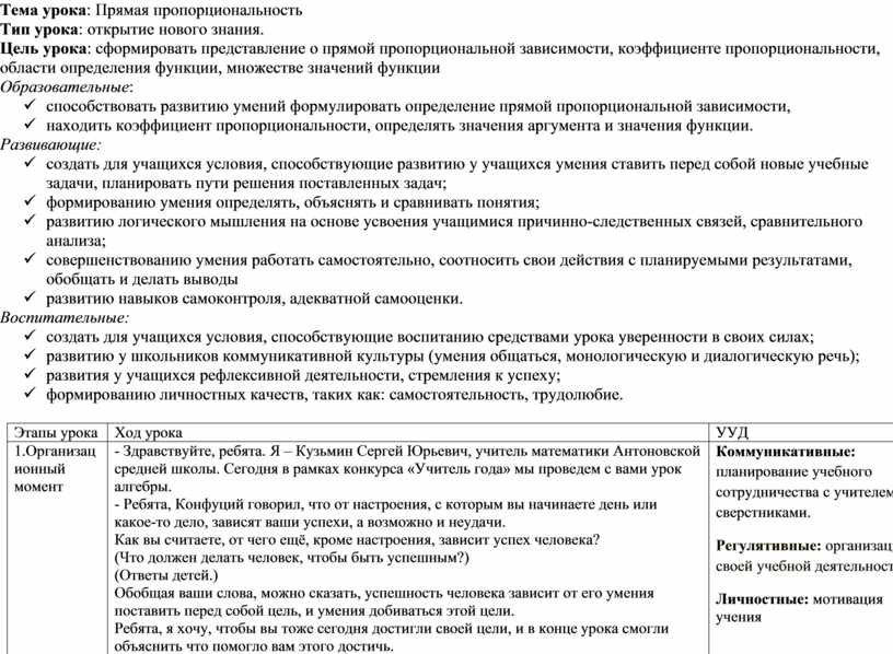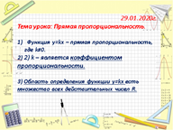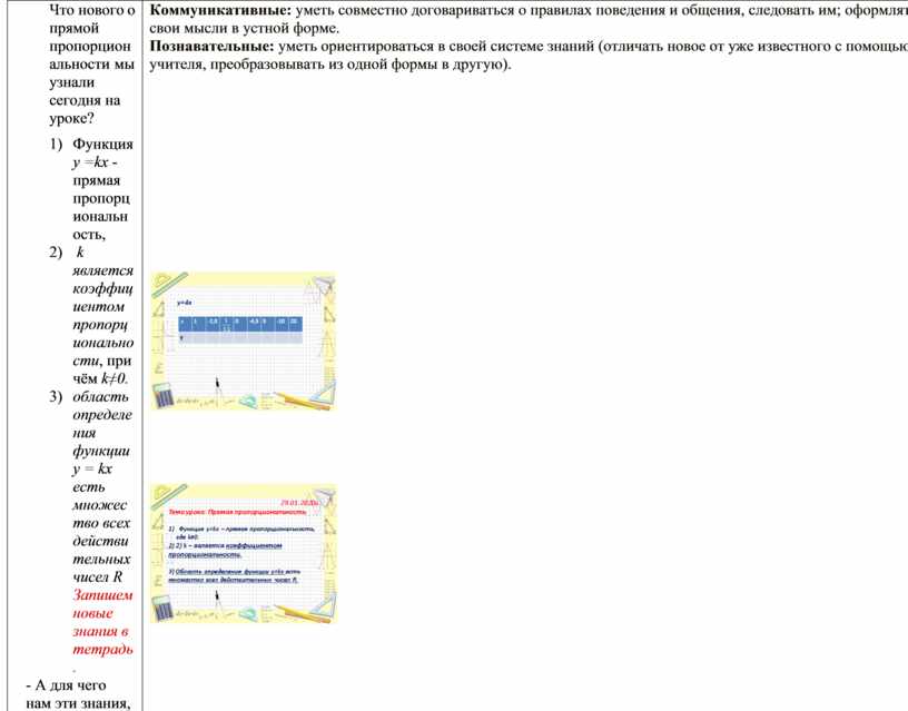 Цель урока: сформировать представление о прямой пропорциональной зависимости, коэффициенте пропорциональности, области определения функции, множестве значений функции