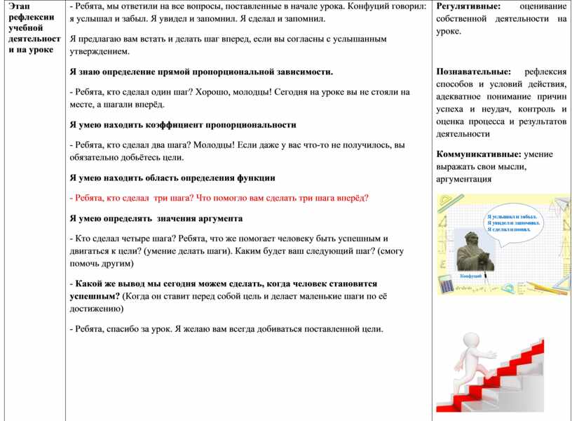 - Ребята, мы ответили на все вопросы, поставленные в начале урока. Конфуций говорил: я услышал и забыл. Я увидел и запомнил. Я сделал и запомнил. Я предлагаю вам встать и делать шаг вперед, если вы согласны с услышанным утверждением. Я знаю определение прямой пропорциональной зависимости. - Ребята, кто сделал один шаг? Хорошо, молодцы! Сегодня на уроке вы не стояли на месте, а шагали вперёд. Я умею находить коэффициент пропорциональности - Ребята, кто сделал два шага? Молодцы! Если даже у вас что-то не получилось, вы обязательно добьётесь цели. Я умею находить область определения функции - Ребята, кто сделал три шага? Что помогло вам сделать три шага вперёд? Я умею определять значения аргумента - Кто сделал четыре шага? Ребята, что же помогает человеку быть успешным и двигаться к цели? (умение делать шаги). Каким будет ваш следующий шаг? (смогу помочь другим) - Какой же вывод мы сегодня можем сделать, когда человек становится успешным? (Когда он ставит перед собой цель и делает маленькие шаги по её достижению) - Ребята, спасибо за урок. Я желаю вам всегда добиваться поставленной цели.