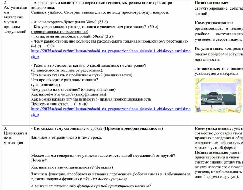 - А если скорость будет равна 30км? (27 с) - Как увеличивается расход топлива с увеличением расстояния? (30 с) (пропорционально расстоянию) - Тогда, если автомобиль пройдёт 50км? (2 л)- - Чему равно отношение количества расходуемого топлива к пройденному расстоянию (41 с) 0,04 https://2035school.ru/htmllesson/zadachi_na_proporczionalnoe_delenie_i_chislovye_zavisimosti_# - Ребята, кто сможет ответить, о какой зависимости снят ролик? (О зависимости топлива от расстояния). Что можно сказать о пройденном пути? (увеличивается) Что происходит с расходом топлива? (увеличивается) Чему равно их отношение? (одному значению) Как назовём это число? (коэффициентом) Как можно назвать эту зависимость? (прямая пропорциональность) Проверим ваш ответ…..(1 мин) https://2035school.ru/htmllesson/zadachi_na_proporczionalnoe_delenie_i_chislovye_zavisimosti_#