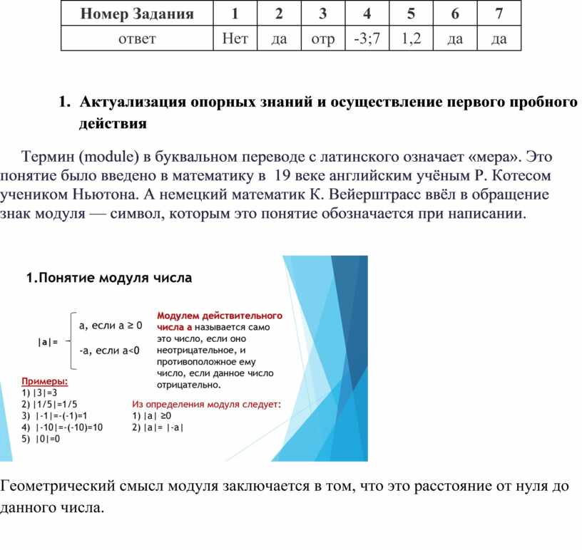 2.     Актуализация опорных знаний и осуществление первого пробного действия  (понятие модуля числа,  геометрический смысл модуля, график модуля)