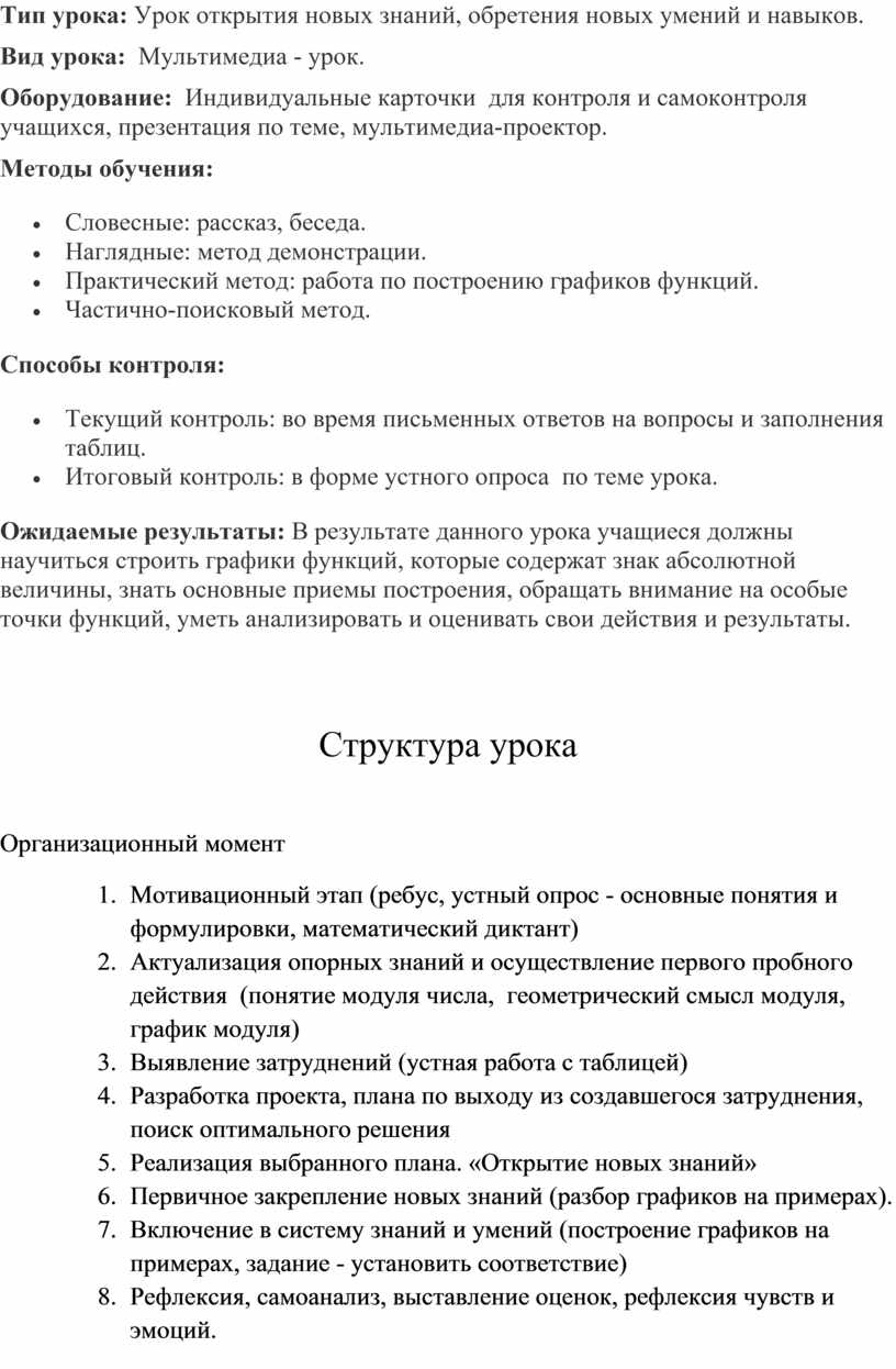 Ожидаемые результаты: В результате данного урока учащиеся должны научиться строить графики функций, которые содержат знак абсолютной величины, знать основные приемы построения, обращать внимание на особые точки функций, уметь анализировать и оценивать свои действия и результаты.