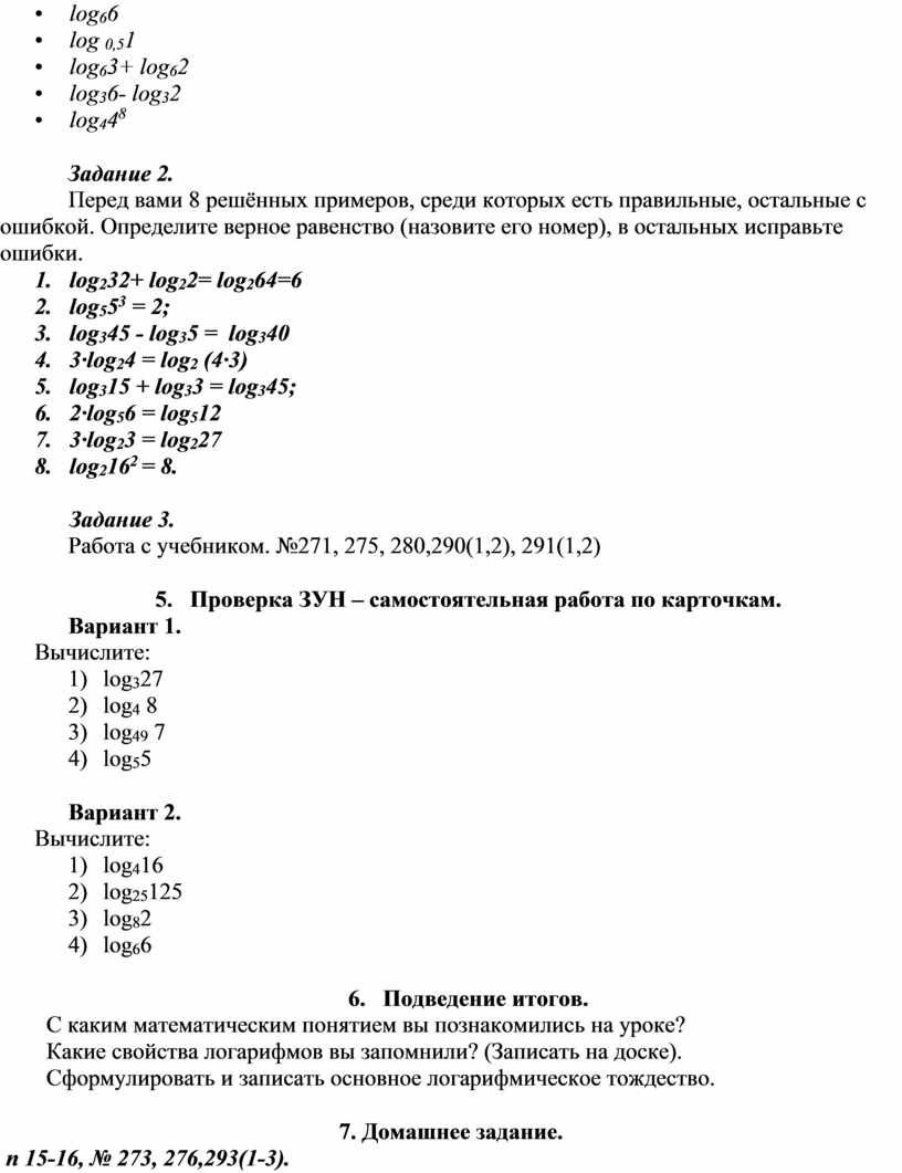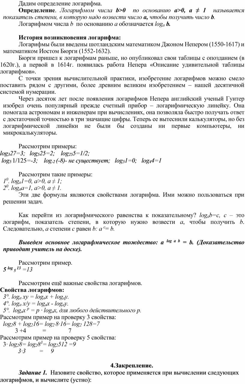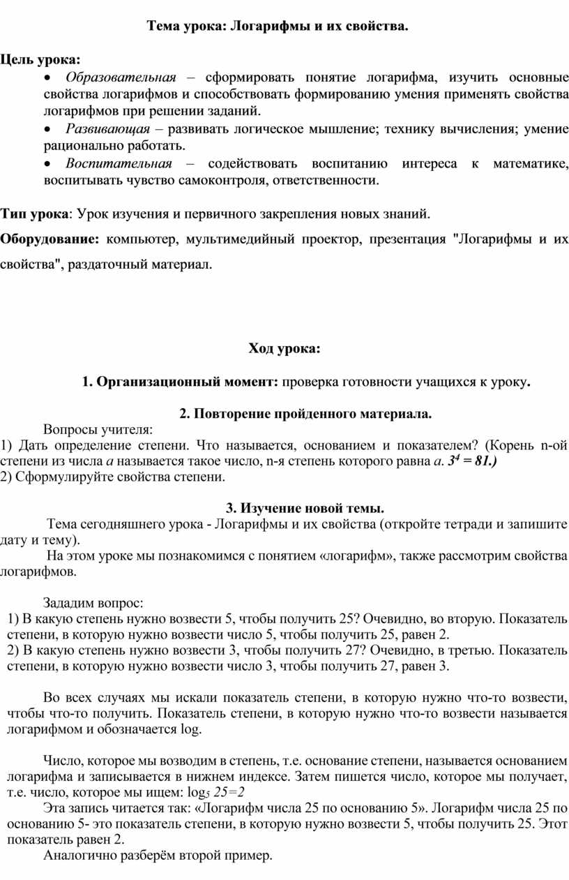 · Образовательная – сформировать понятие логарифма, изучить основные свойства логарифмов и способствовать формированию умения применять свойства логарифмов при решении заданий.