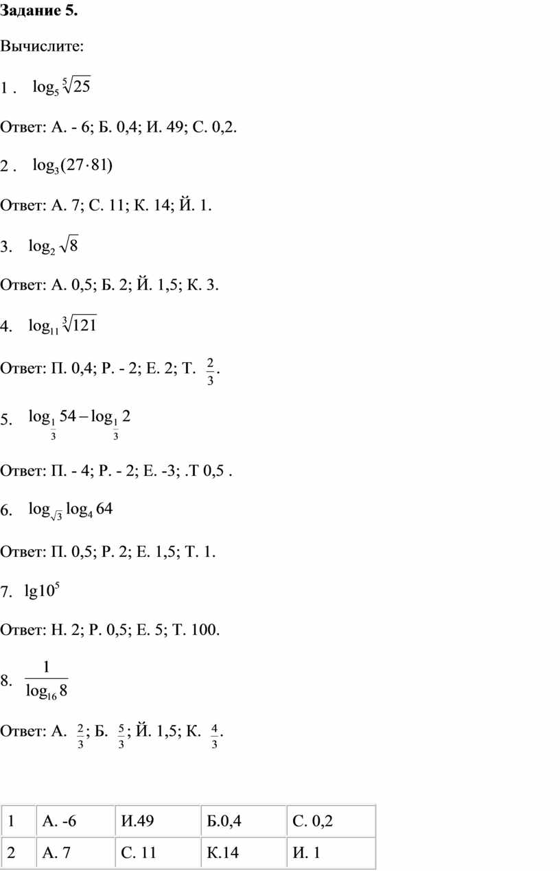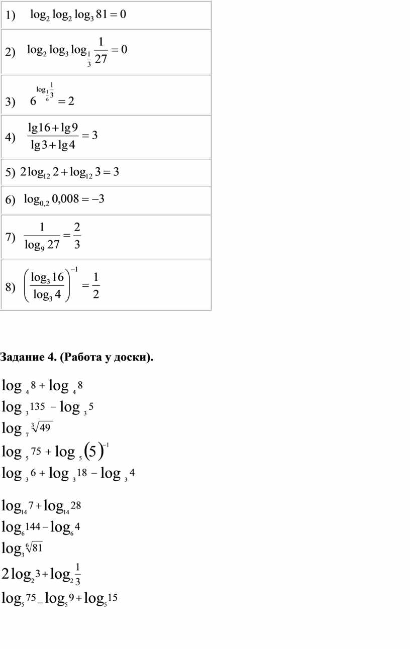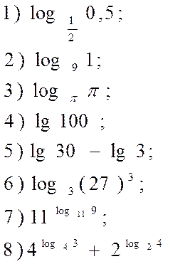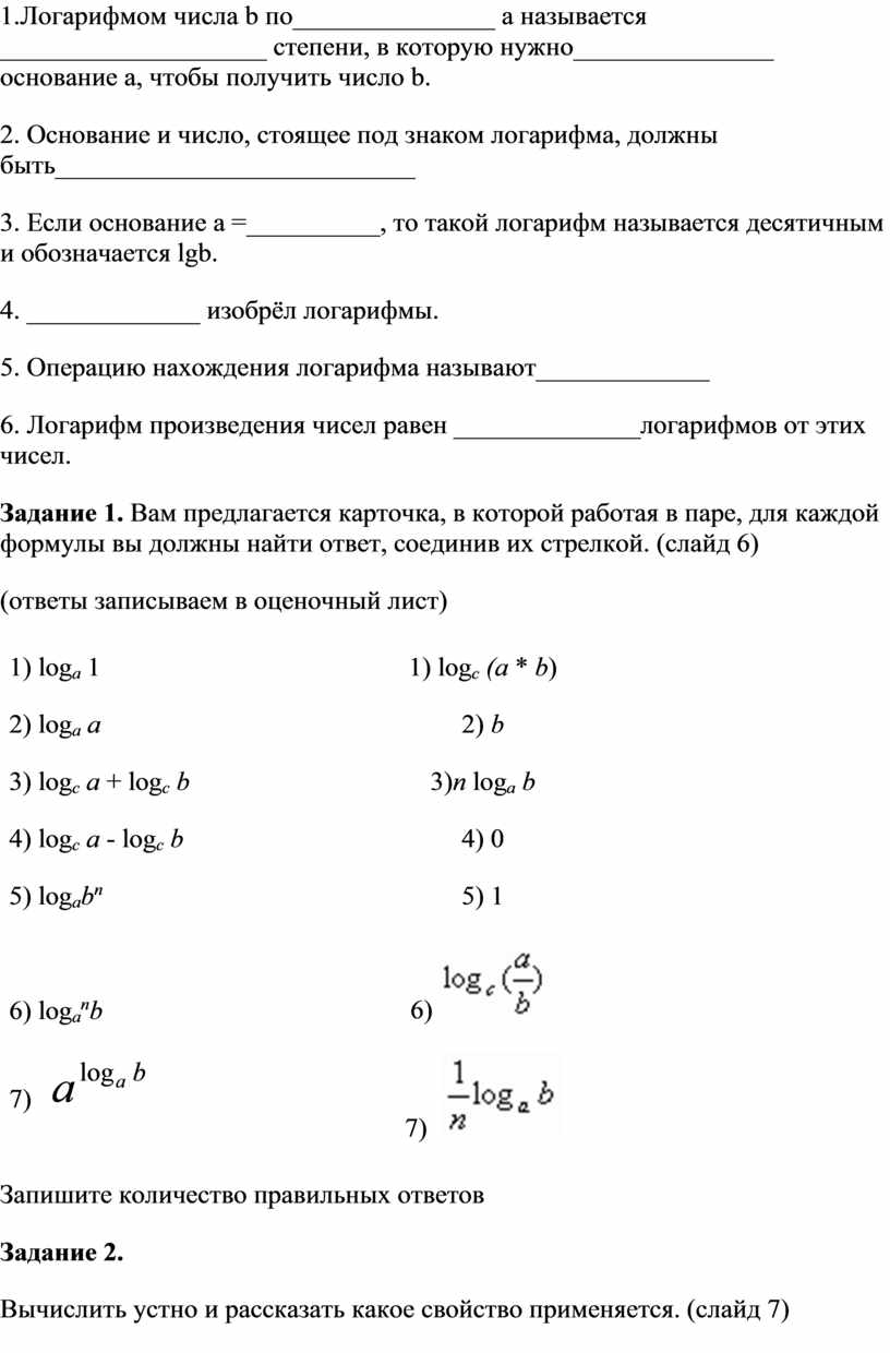 1) logс (a * b) 2) b 3)n loga b 4) 0 5) 1 6) 7)