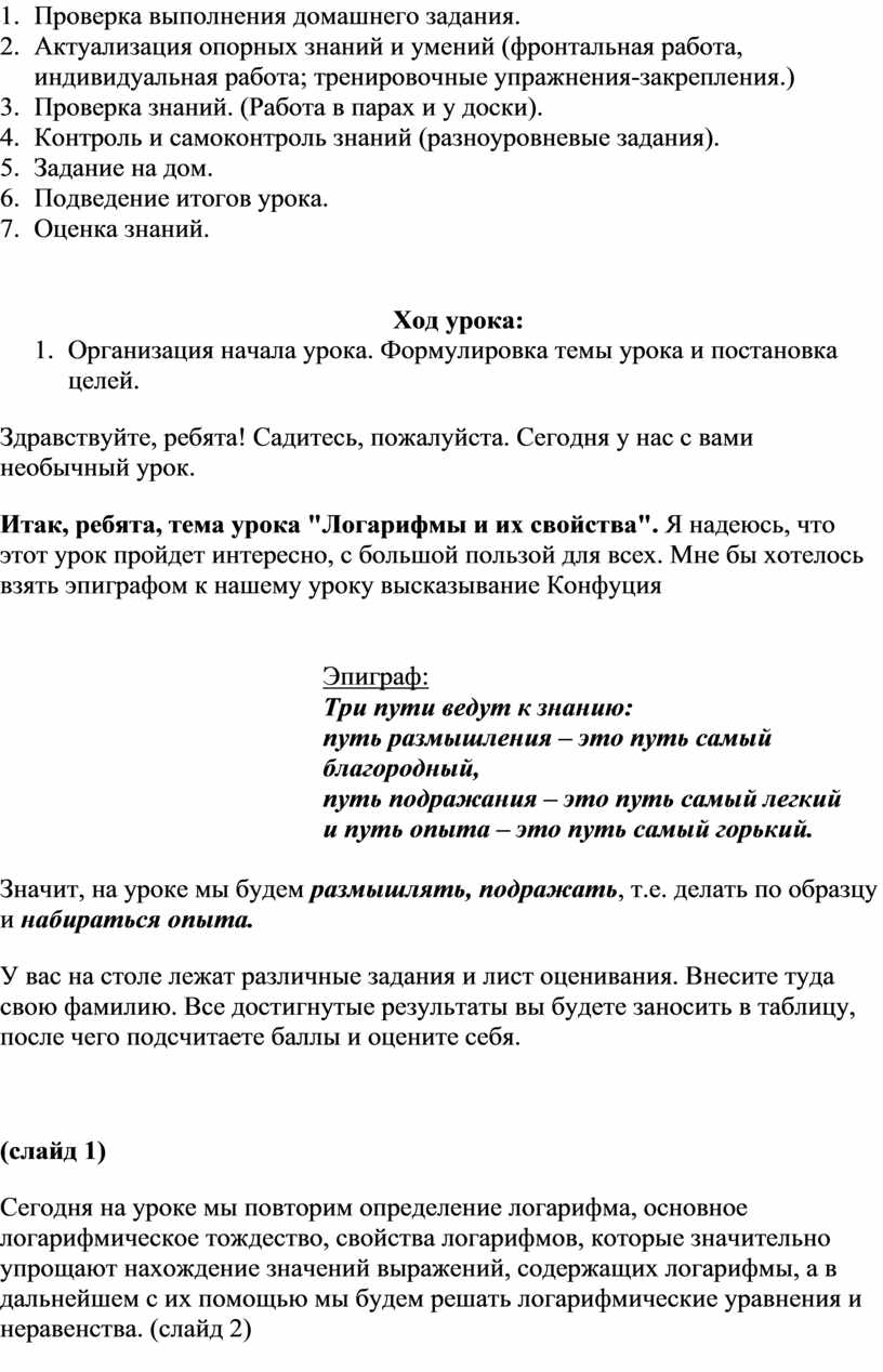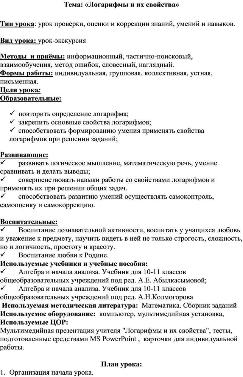 ü совершенствовать навыки работы со свойствами логарифмов и применять их при решении общих задач.