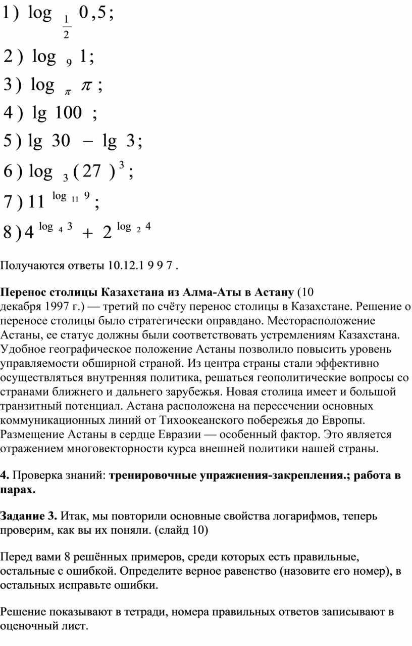 ü способствовать формированию умения применять свойства логарифмов при решении заданий;