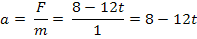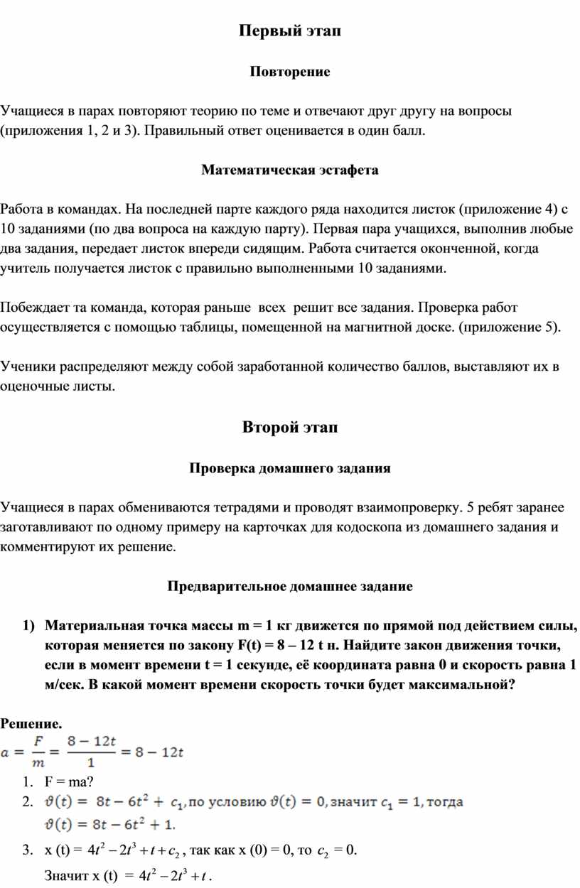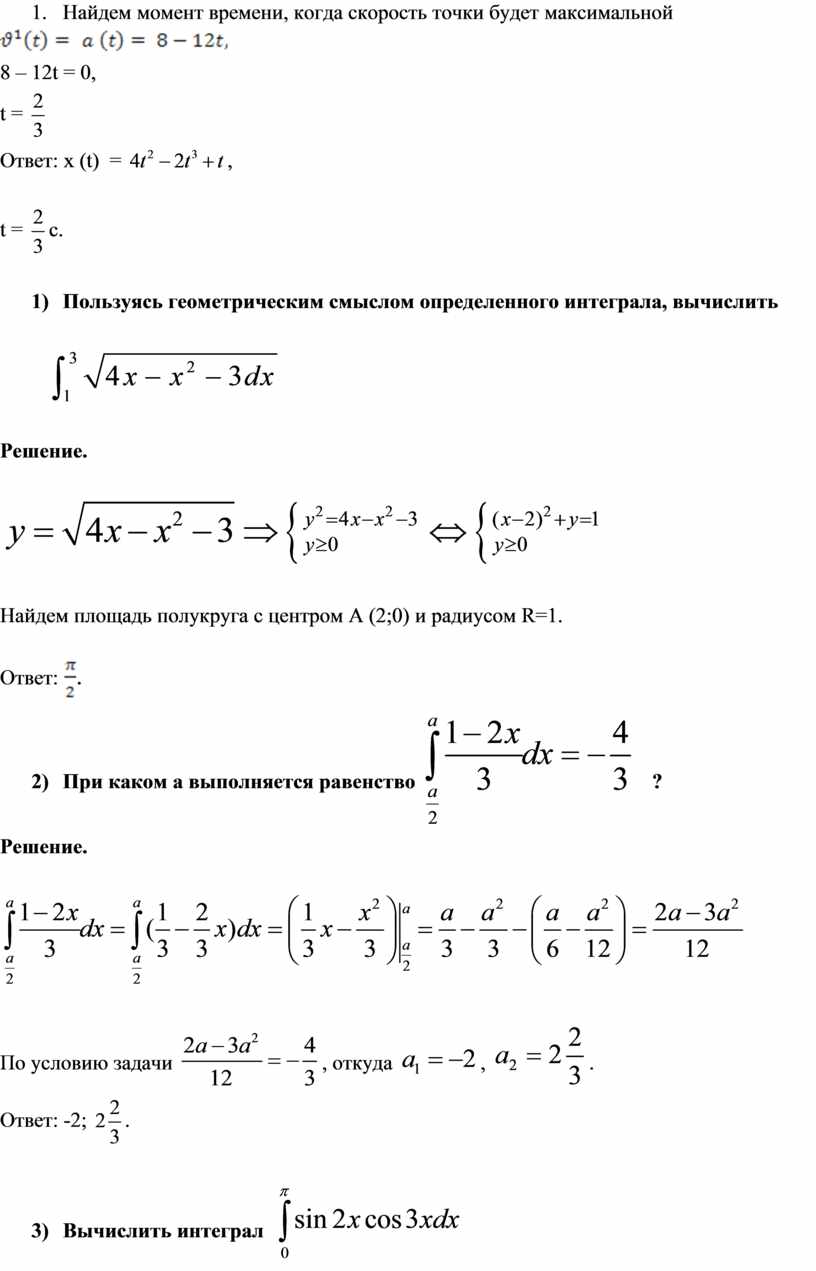 1) Материальная точка массы m = 1 кг движется по прямой под действием силы, которая меняется по закону F(t) = 8 – 12 t н. Найдите закон движения точки, если в момент времени t = 1 секунде, её координата равна 0 и скорость равна 1 м/сек. В какой момент времени скорость точки будет максимальной?