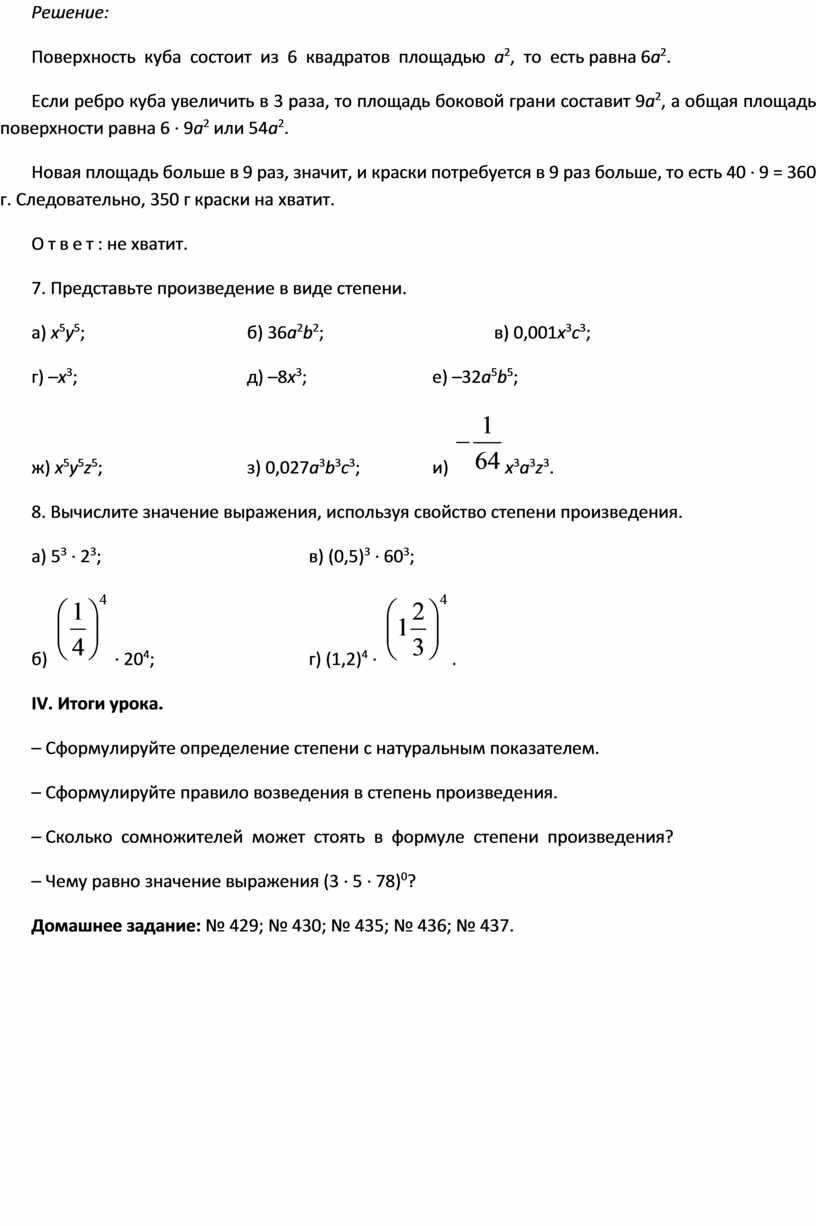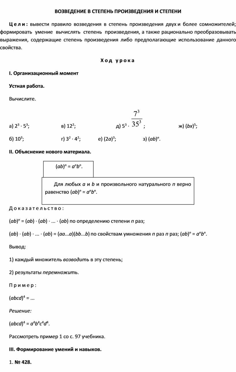 Цели: вывести правило возведения в степень произведения двух и более сомножителей; формировать умение вычислять степень произведения, а также рационально преобразовывать выражения, содержащие степень произведения либо предполагающие использование данного свойства.