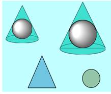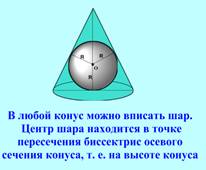 - Итак, перед вами конус и шар. Начнем с определения: - Шар вписан в конус, если…(продолжите) (Записать) – если сфера касается основания конуса и каждой его образующей. Передвигая фигуры, обсудить следующие вопросы: - Как вы думаете, в любой ли конус можно вписать в шар? Как доказать? Рассмотрим сечения этих тел. - Что представляет собой осевое сечение конуса? - Что представляет собой диаметральное сечение шара? Передвигая фигуры, обсуждаем - Если шар вписан в конус, то каково должно быть взаимное расположение сечений? - В какой треугольник? Всегда ли в конус можно вписать шар? Почему? - Где будет находиться центр шара? |