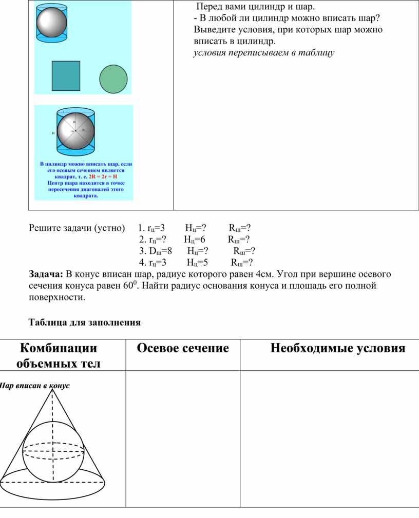 Перед вами цилиндр и шар. - В любой ли цилиндр можно вписать шар? Выведите условия, при которых шар можно вписать в цилиндр. условия переписываем в таблицу |