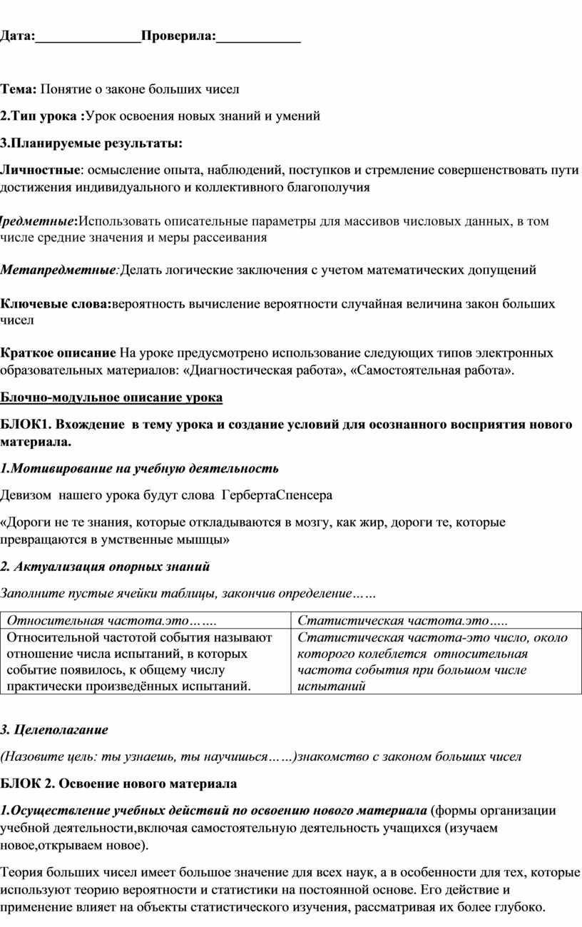Тема: Понятие о законе больших чисел