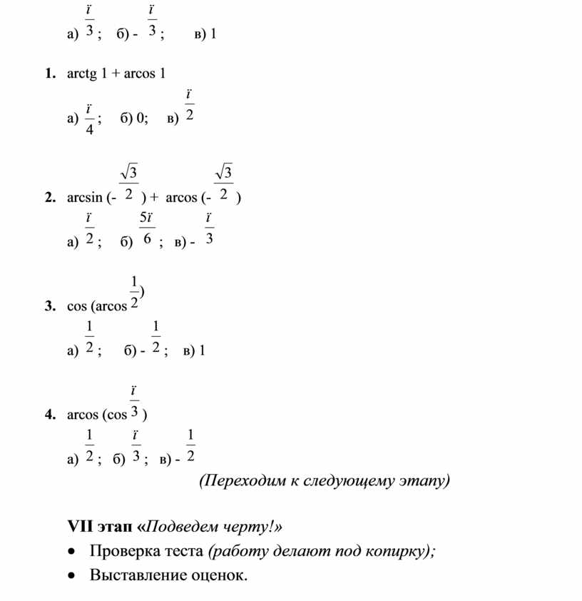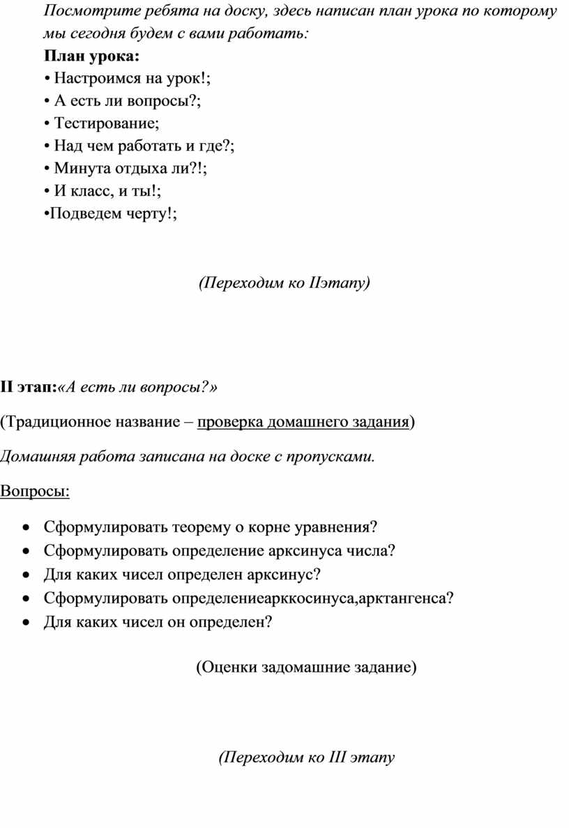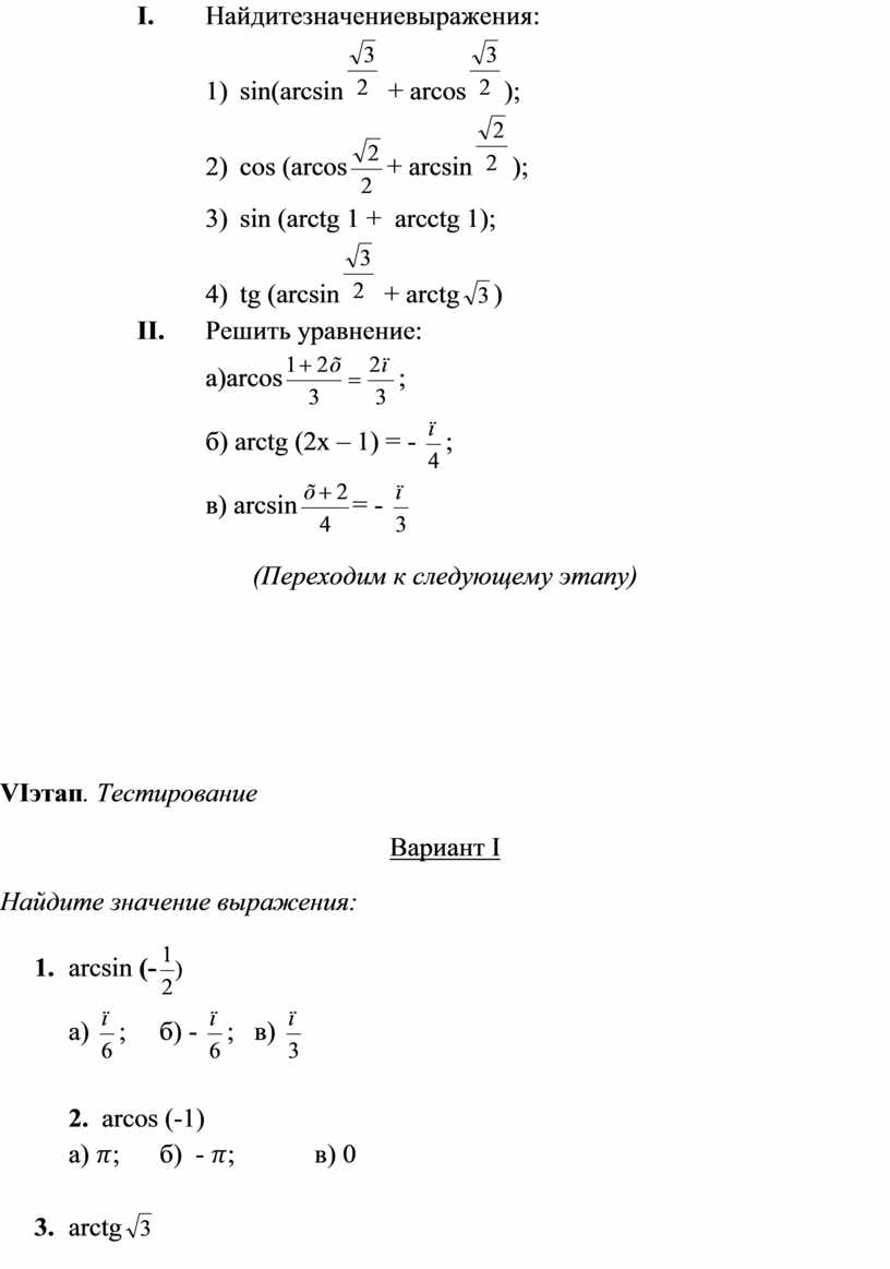 · Закрепление понятия арксинус, арккосинус, арктангенс и арккотангенс и навыки вычисления их при решении более сложных упражнений;