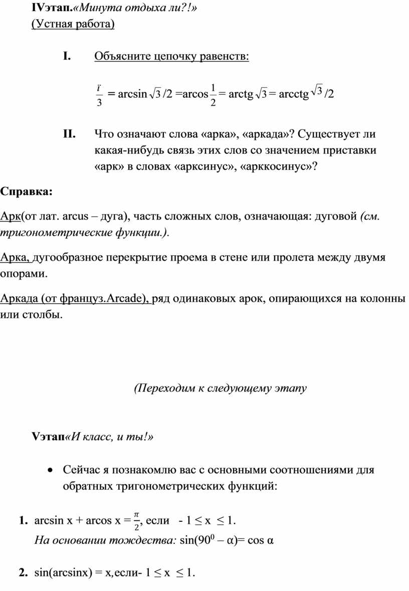 II. Что означают слова «арка», «аркада»? Существует ли какая-нибудь связь этих слов со значением приставки «арк» в словах «арксинус», «арккосинус»?