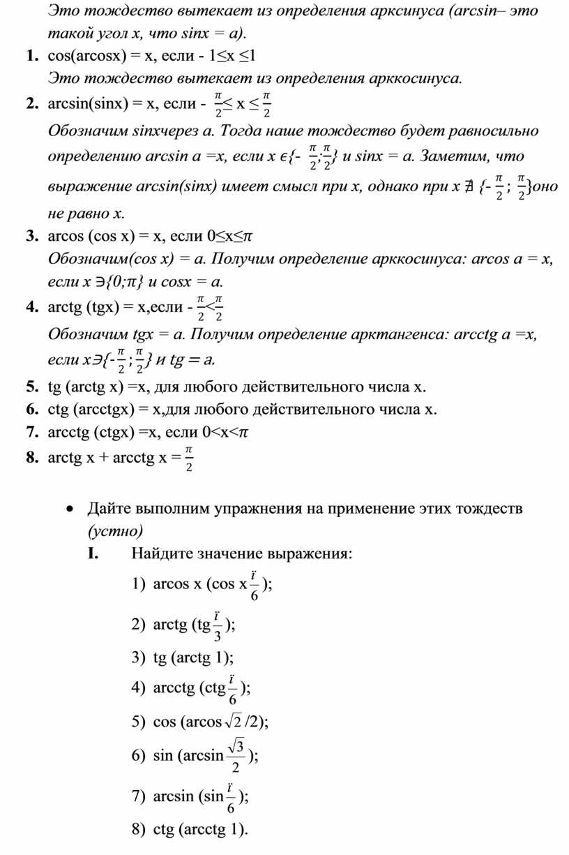 2. sin(arcsinx) = x,если- 1 ≤ х ≤ 1.