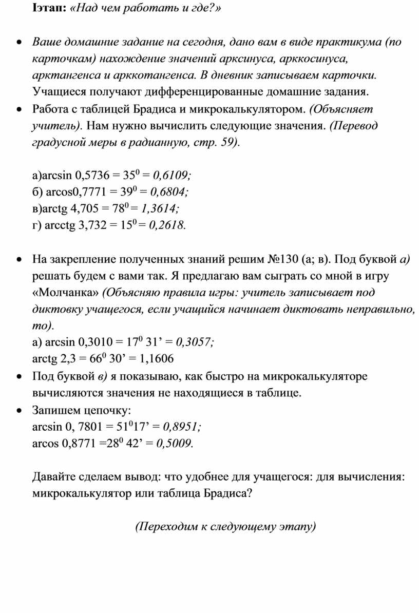 · Работа с таблицей Брадиса и микрокалькулятором. (Объясняет учитель). Нам нужно вычислить следующие значения. (Перевод градусной меры в радианную, стр. 59).