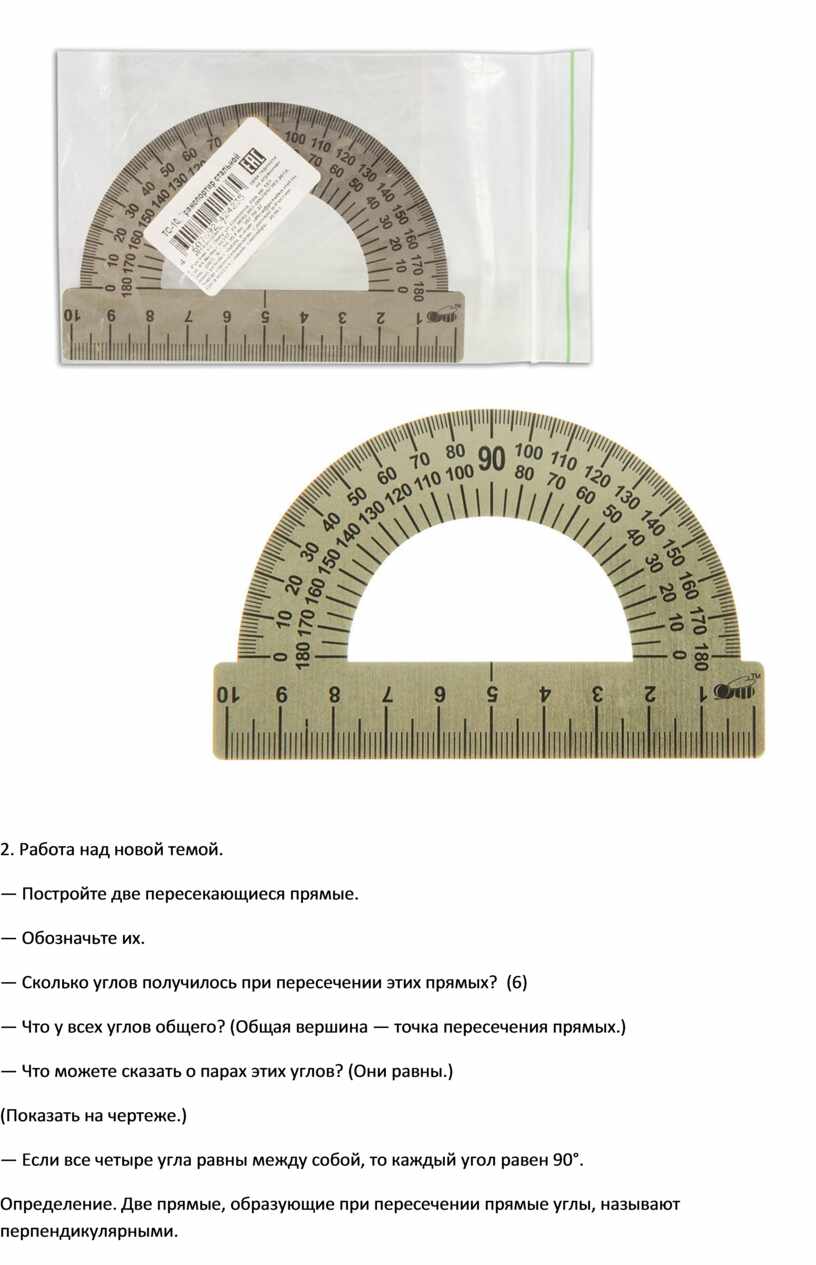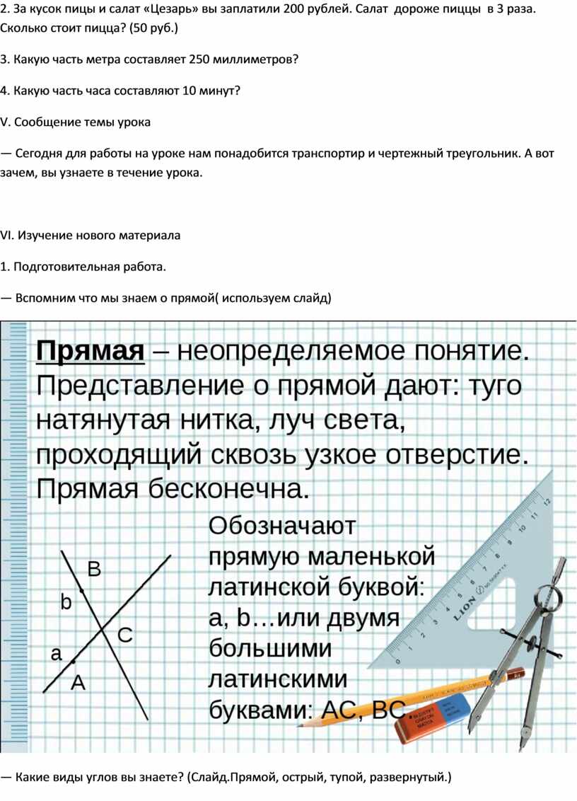 — Сегодня для работы на уроке нам понадобится транспортир и чертежный треугольник. А вот зачем, вы узнаете в течение урока.