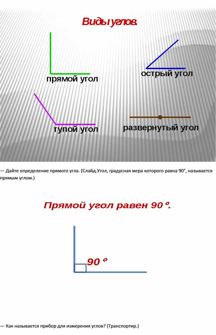 — Дайте определение прямого угла. (Слайд.Угол, градусная мера которого равна 90°, называется прямым углом.)
