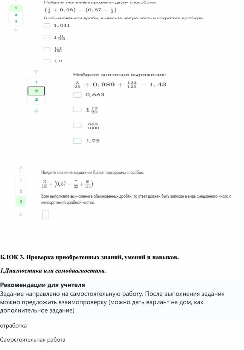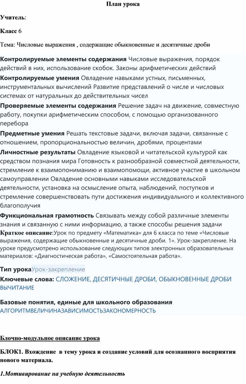 Краткое описание:Урок по предмету «Математика» для 6 класса по теме «Числовые выражения, содержащие обыкновенные и десятичные дроби. 1». Урок-закрепление. На уроке предусмотрено использование следующих типов электронных образовательных материалов: «Диагностическая работа», «Самостоятельная работа».