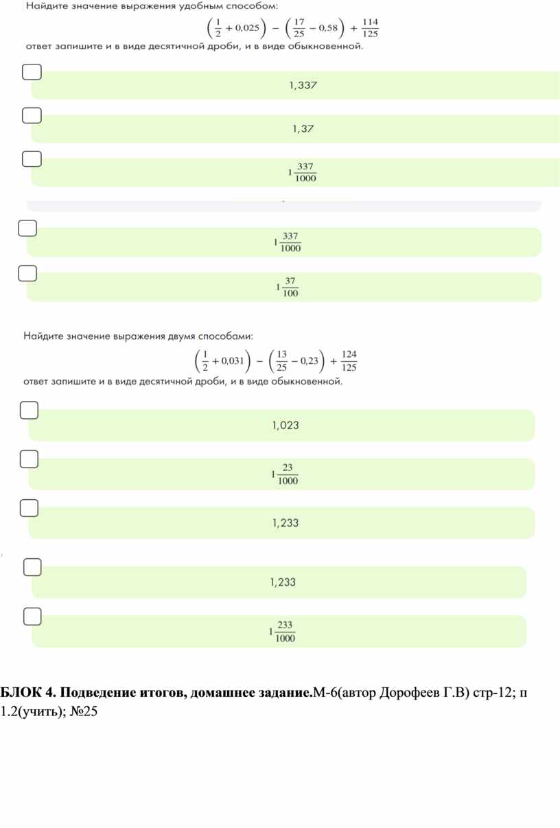БЛОК 4. Подведение итогов, домашнее задание.М-6(автор Дорофеев Г.В) стр-12; п 1.2(учить); №25