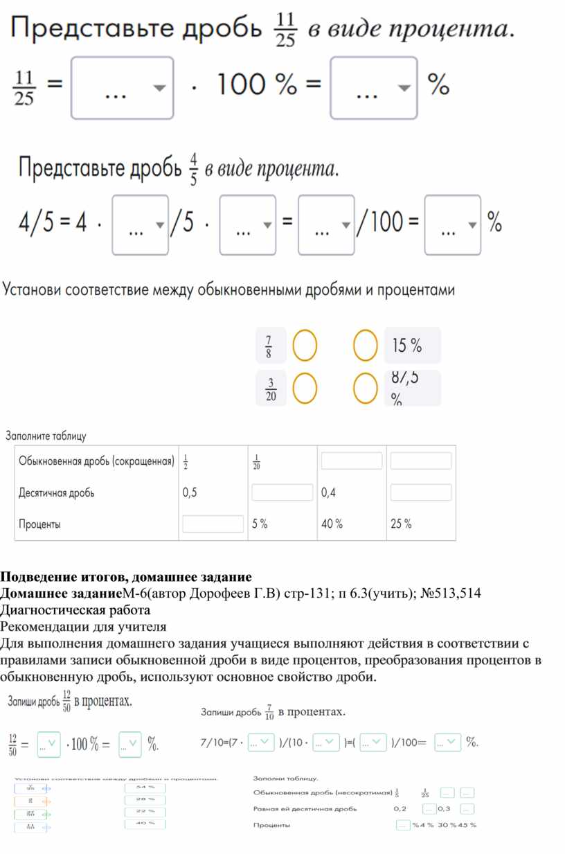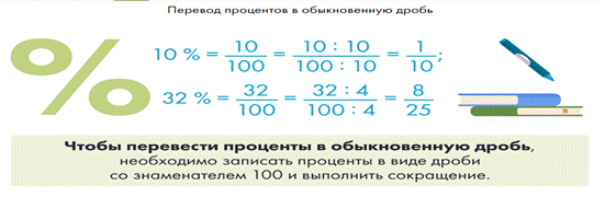 Для выполнения домашнего задания учащиеся выполняют действия в соответствии с правилами записи обыкновенной дроби в виде процентов, преобразования процентов в обыкновенную дробь, используют основное свойство дроби.
