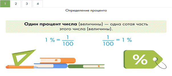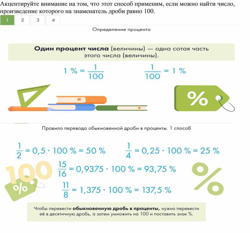 Повторите с учащимися определение процента. Акцентируйте внимание на числителе дроби 1100. Вспомните правило перевода десятичной дроби в проценты.