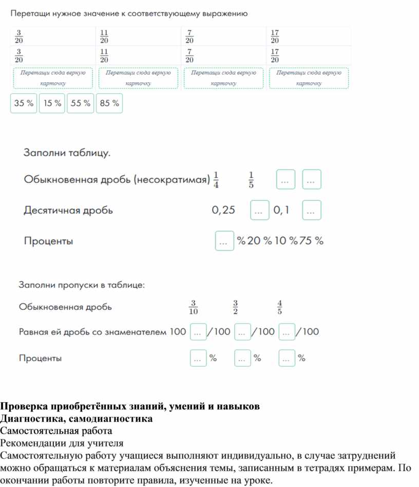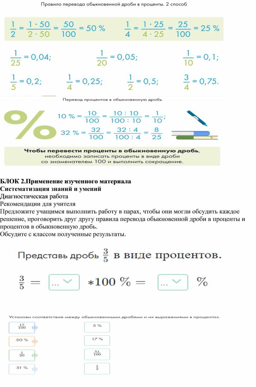 Предложите учащимся выполнить работу в парах, чтобы они могли обсудить каждое решение, проговорить друг другу правила перевода обыкновенной дроби в проценты и процентов в обыкновенную дробь.