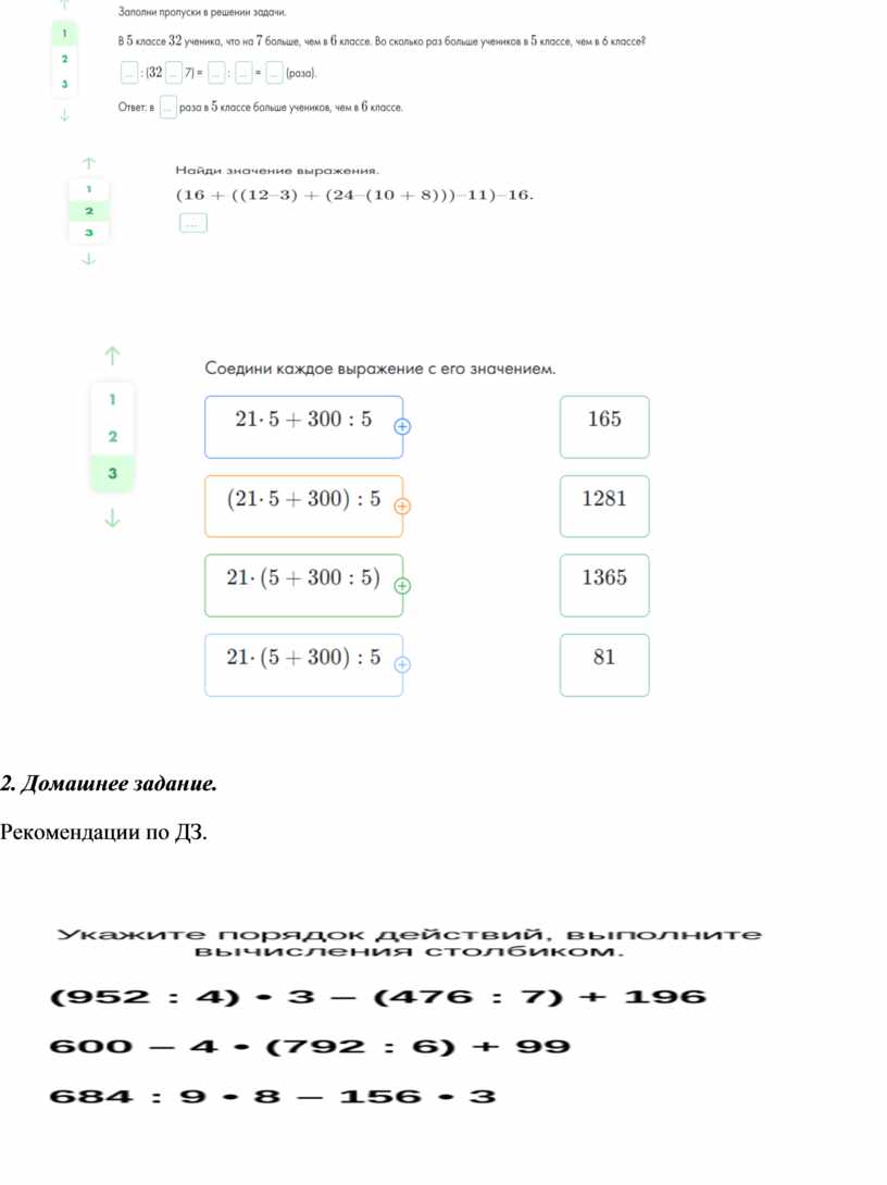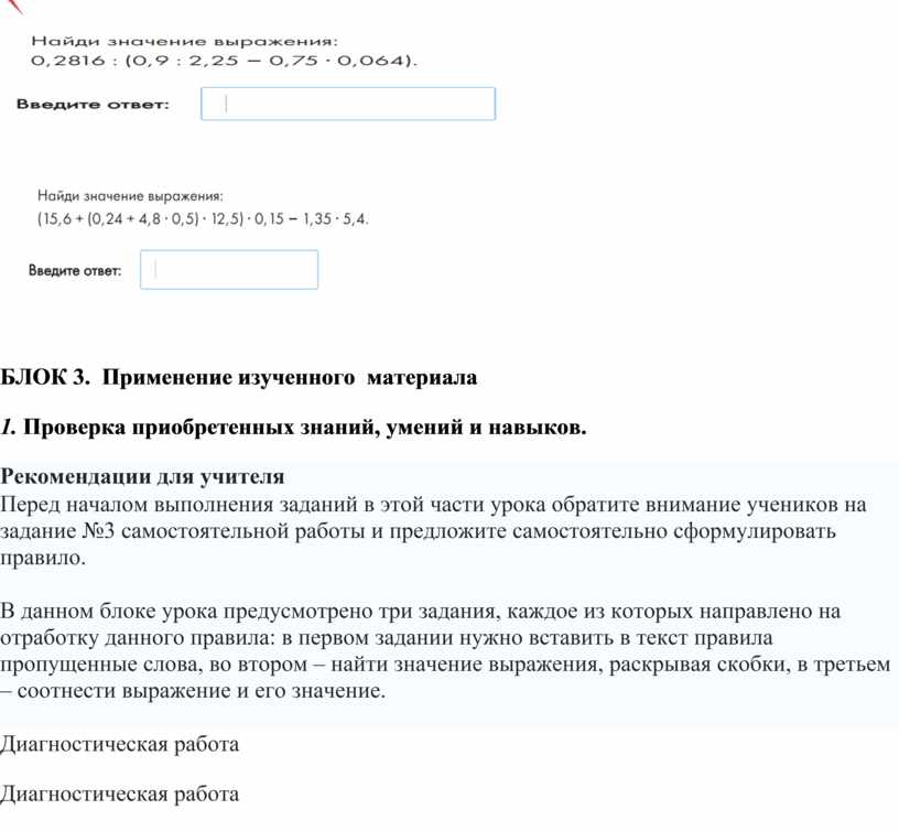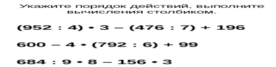В четвертом и пятом задании необходимо найти значение выражения. Поскольку в данном случае важно отработать порядок действий, то разумно разрешить ученикам использовать калькулятор для вычислений.