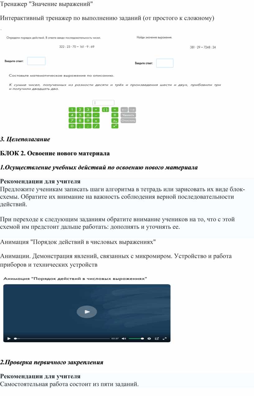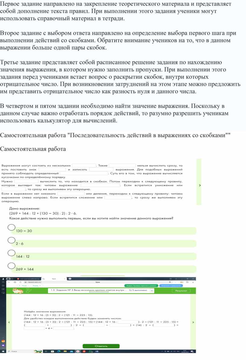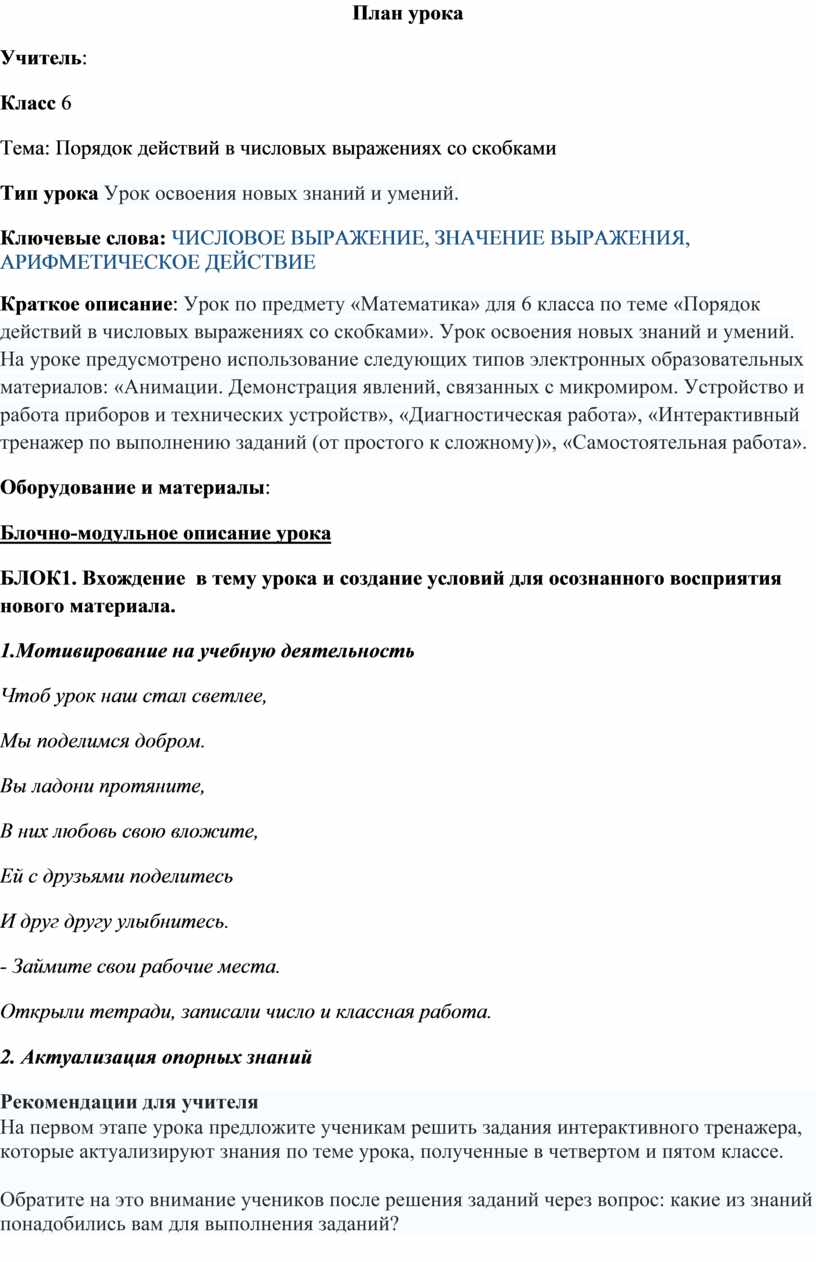Краткое описание: Урок по предмету «Математика» для 6 класса по теме «Порядок действий в числовых выражениях со скобками». Урок освоения новых знаний и умений. На уроке предусмотрено использование следующих типов электронных образовательных материалов: «Анимации. Демонстрация явлений, связанных с микромиром. Устройство и работа приборов и технических устройств», «Диагностическая работа», «Интерактивный тренажер по выполнению заданий (от простого к сложному)», «Самостоятельная работа».