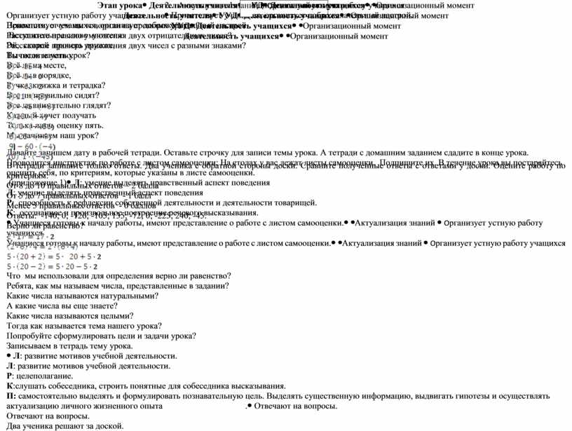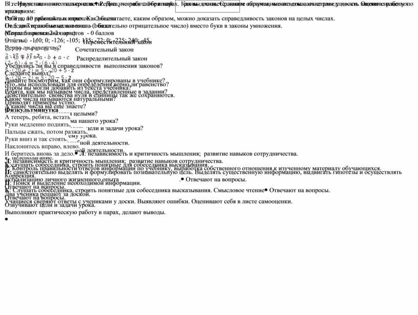 Выполнять вычисления с целыми числами. Формулировать и записывать с помощью букв свойства действий с целыми числами, применять их для преобразований числовых выражений. Решать простейшие задачи на основе зависимостей между компонентами арифметических действий.