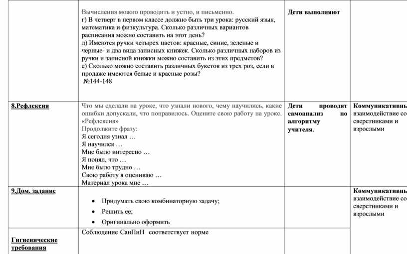 Вычисления можно проводить и устно, и письменно. г) В четверг в первом классе должно быть три урока: русский язык, математика и физкультура. Сколько различных вариантов расписания можно составить на этот день? д) Имеются ручки четырех цветов: красные, синие, зеленые и черные- и два вида записных книжек. Сколько различных наборов из ручки и записной книжки можно составить из этих предметов? е) Сколько можно составить различных букетов из трех роз, если в продаже имеются белые и красные розы? №144-148