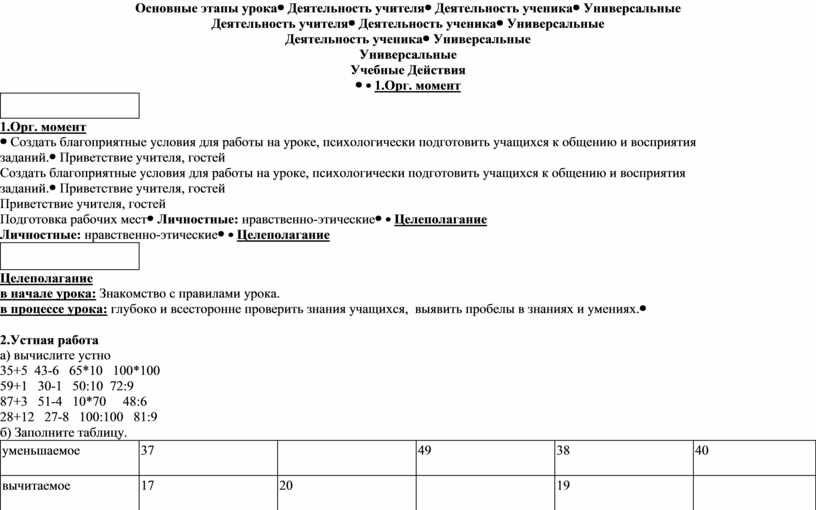 2.Устная работа а) вычислите устно 35+5 43-6 65*10 100*100 59+1 30-1 50:10 72:9 87+3 51-4 10*70 48:6 28+12 27-8 100:100 81:9 б) Заполните таблицу.