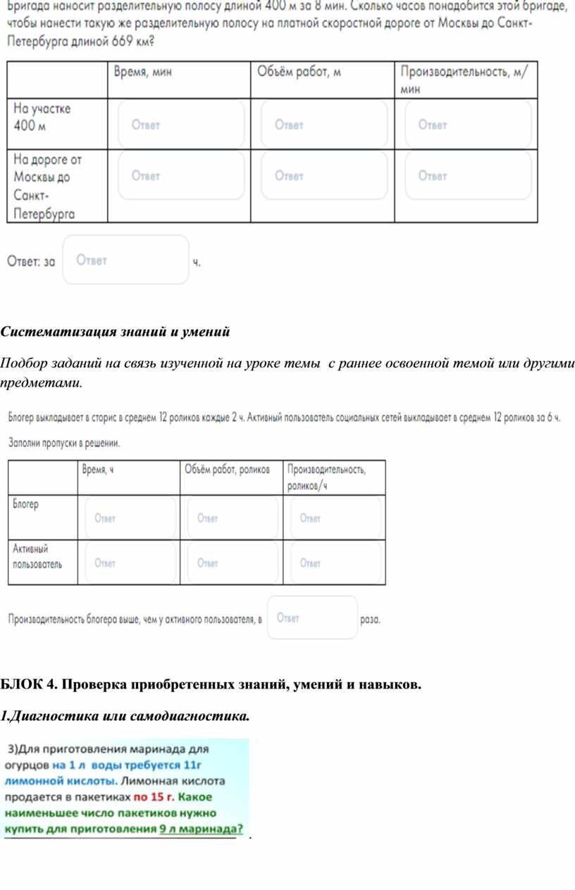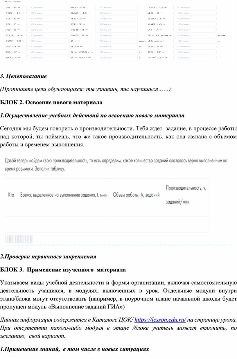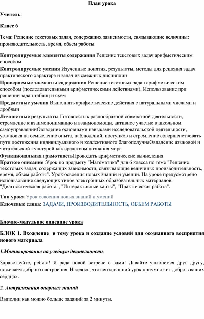 Краткое описание :Урок по предмету "Математика" для 6 класса по теме "Решение текстовых задач, содержащих зависимости, связывающие величины: производительность, время, объем работы". Урок освоения новых знаний и умений. На уроке предусмотрено использование следующих типов электронных образовательных материалов: "Диагностическая работа", "Интерактивные карты", "Практическая работа".