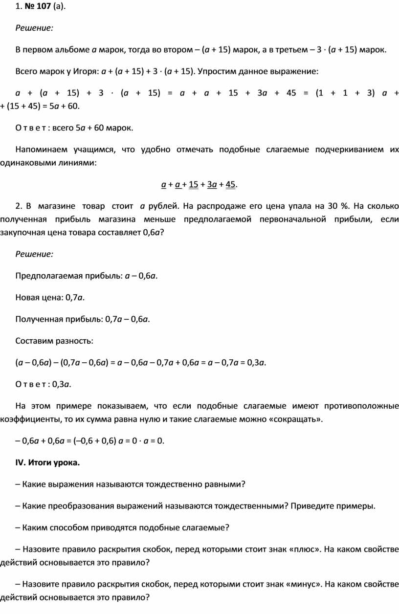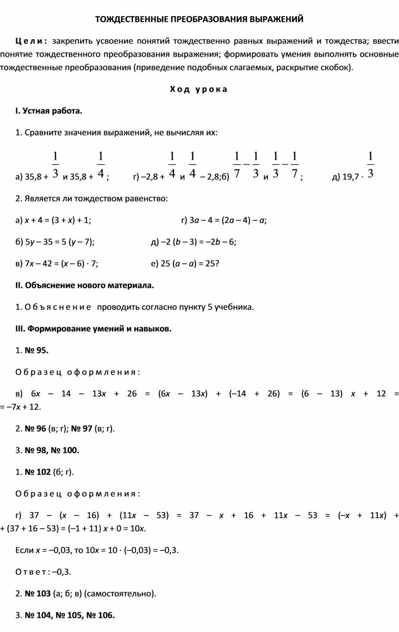 Цели: закрепить усвоение понятий тождественно равных выражений и тождества; ввести понятие тождественного преобразования выражения; формировать умения выполнять основные тождественные преобразования (приведение подобных слагаемых, раскрытие скобок).
