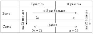 Пусть х кустов малины было на втором садовом участке, тогда на первом было 5х кустов. После пересадки на первом участке осталось (5х – 22) кустов малины, а на втором стало (х + 22) куста малины. Зная, что после пересадки на обоих участках стало кустов малины поровну, составим уравнение: