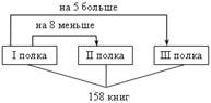 Пусть на первой полке расположено п книг, тогда на второй полке – (п + 8), а на третьей – (п – 5) книг. Зная, что на трех полках необходимо расположить всего 158 книг, составим уравнение:
