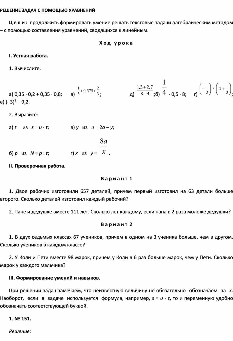 Цели: продолжить формировать умение решать текстовые задачи алгебраическим методом – с помощью составления уравнений, сводящихся к линейным.