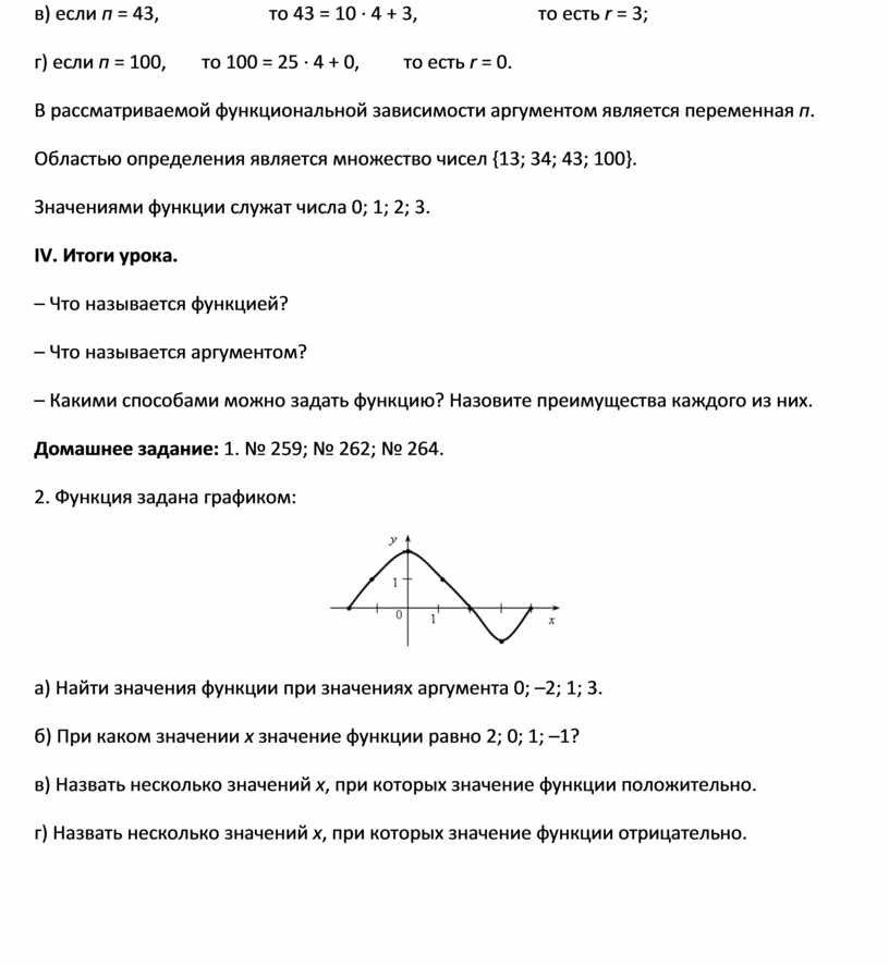 Все задания, решаемые на этом уроке, направлены на усвоение как самого понятия функции, так и различных способов её задания (словесный, с помощью формулы, табличный, графический). Ученики должны уметь переходить от одного вида задания к другому и находить значения функции при каждом способе задания.