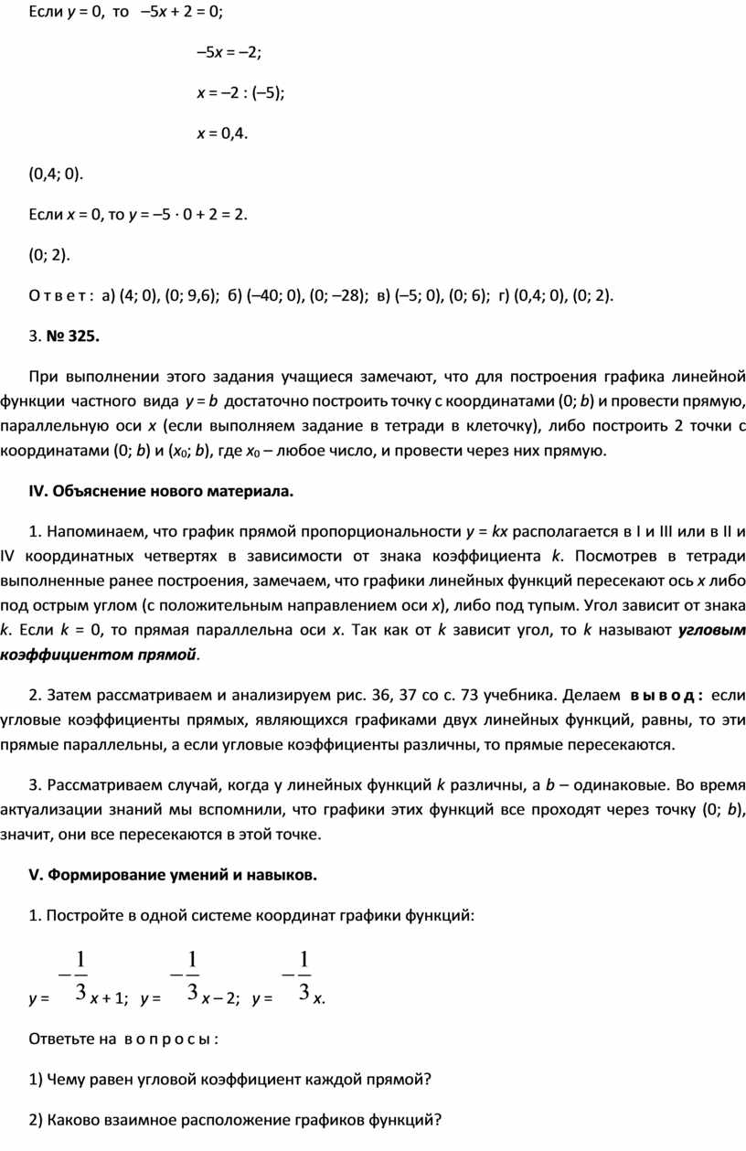 2. Затем рассматриваем и анализируем рис. 36, 37 со с. 73 учебника. Делаем вывод: если угловые коэффициенты прямых, являющихся графиками двух линейных функций, равны, то эти прямые параллельны, а если угловые коэффициенты различны, то прямые пересекаются.