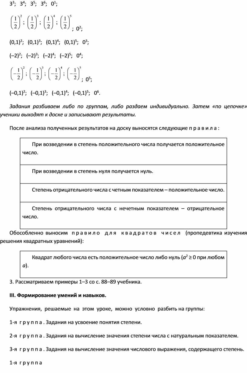 Цели: ввести понятие степени числа а с натуральным показателем п; определить значение степени с натуральным показателем положительного и отрицательного числа в зависимости от четности / нечетности показателя степени; формировать умение вычислять значение степени и представлять число в виде степени с натуральным показателем.